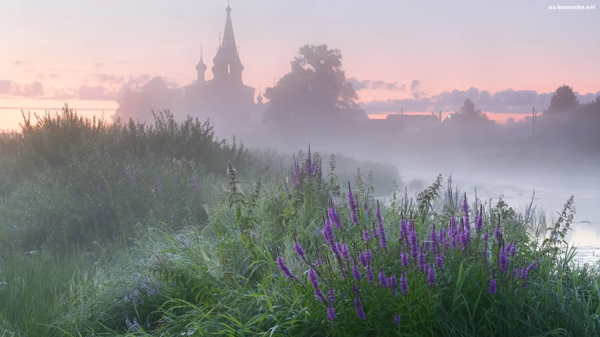 Rzeka, Mgła, Cerkiew, Trawa, Łąka, Kwiaty na Komórkę