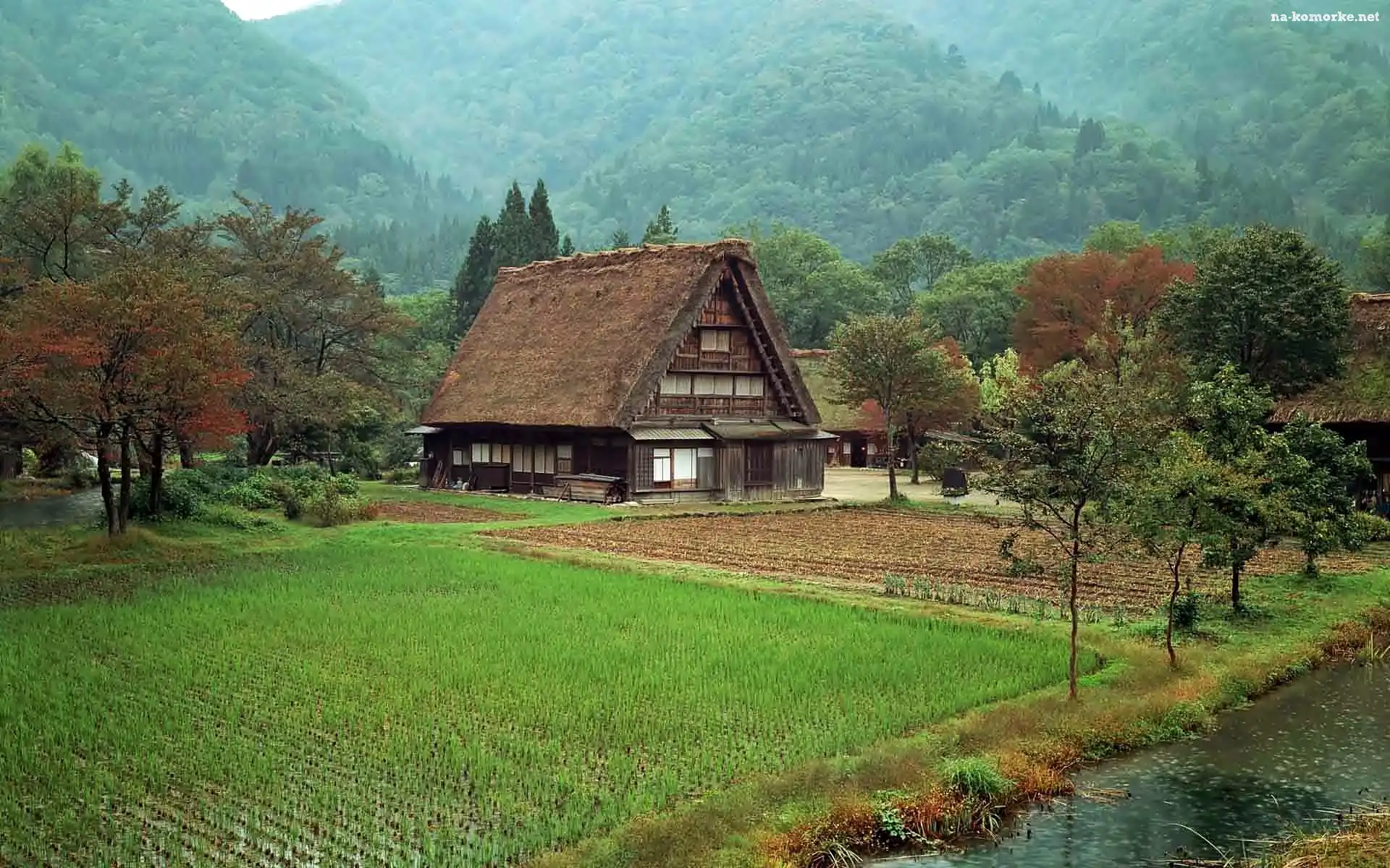 Drewniany, Rzeka, Wieś, Dom, Góry, Lasy, Pole na Komórkę