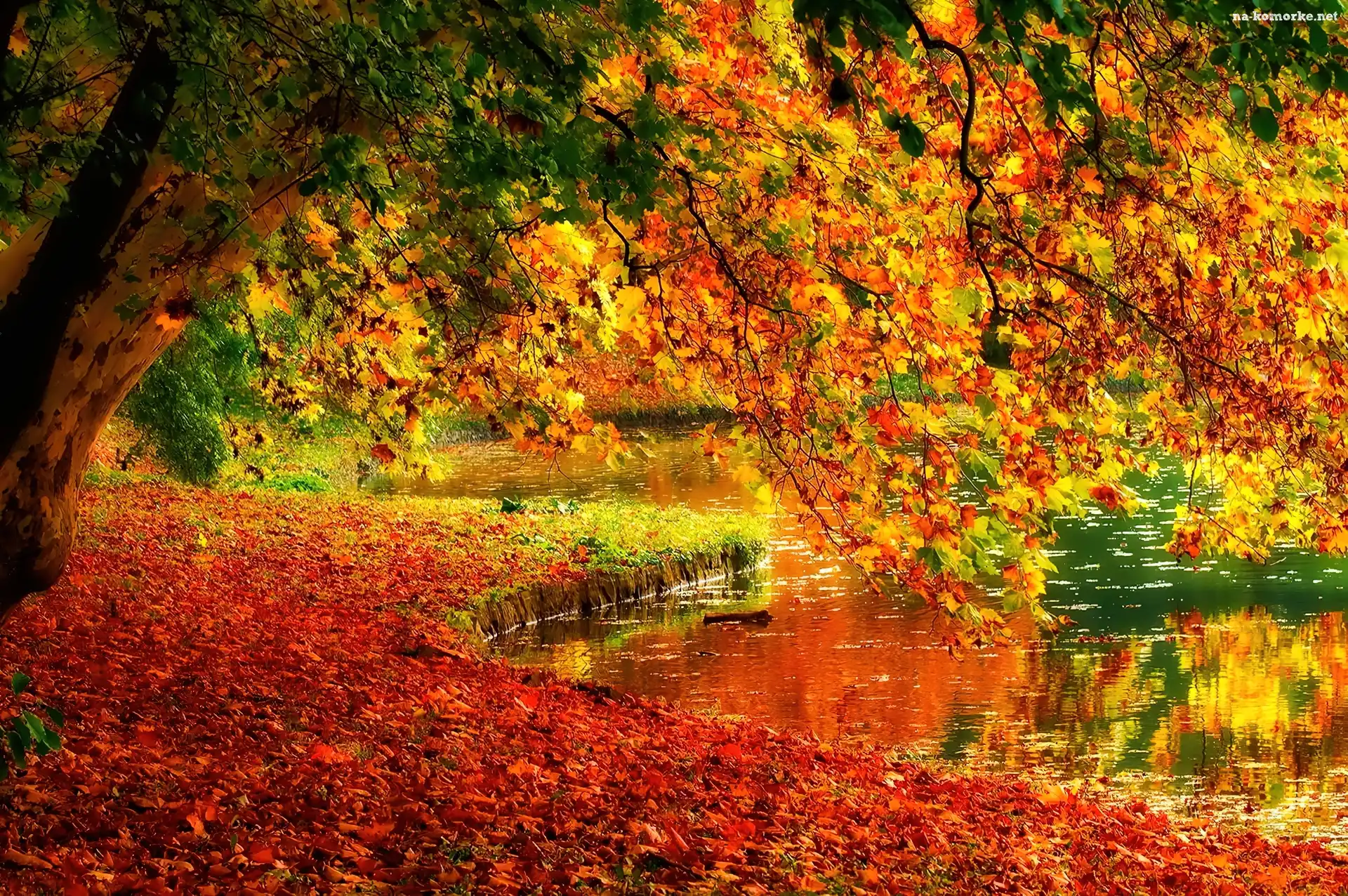 Rzeka, Jesień, Drzewa, Liście na Komórkę