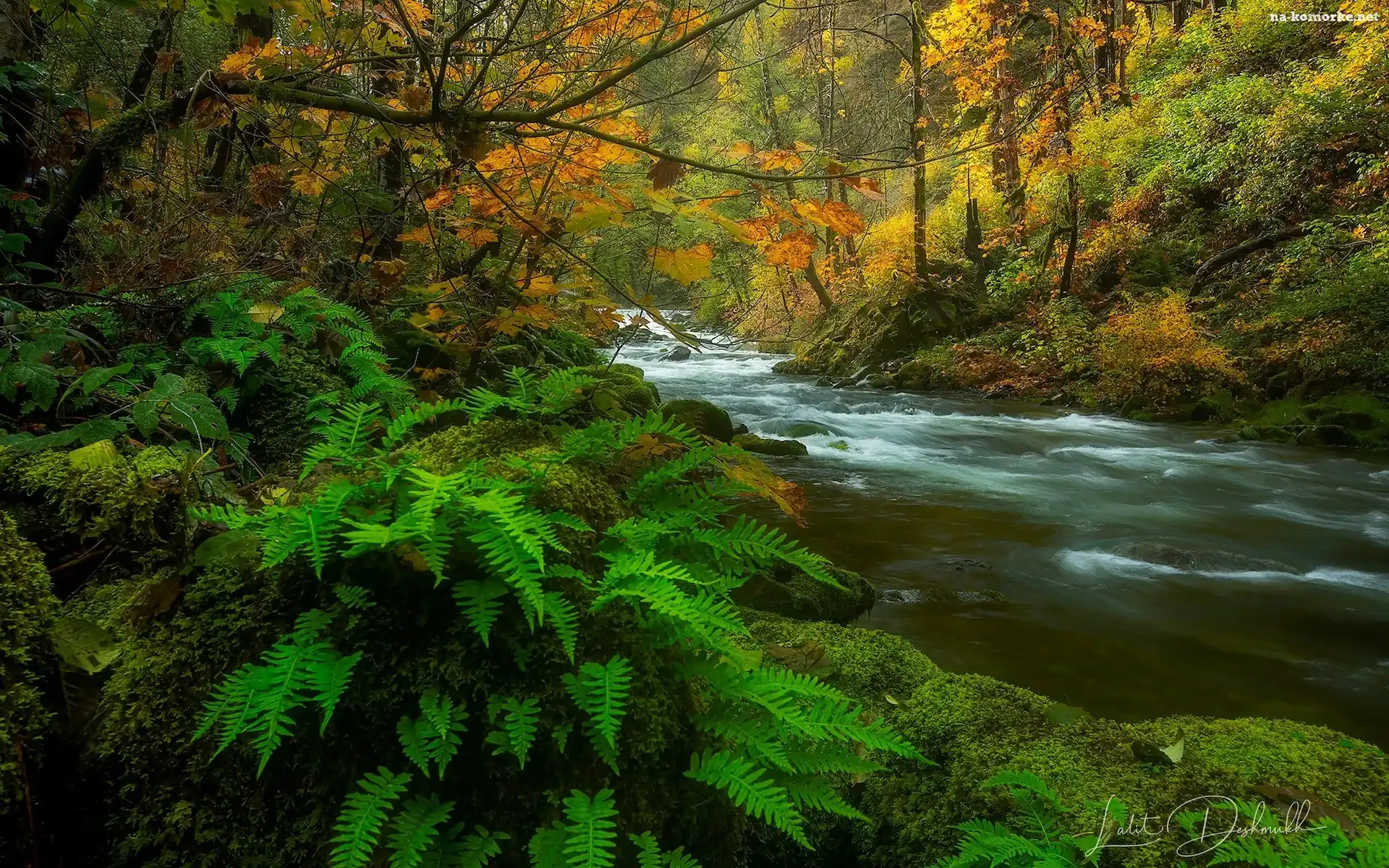 Drzewa, Paprocie, Las, Rzeka na Komórkę