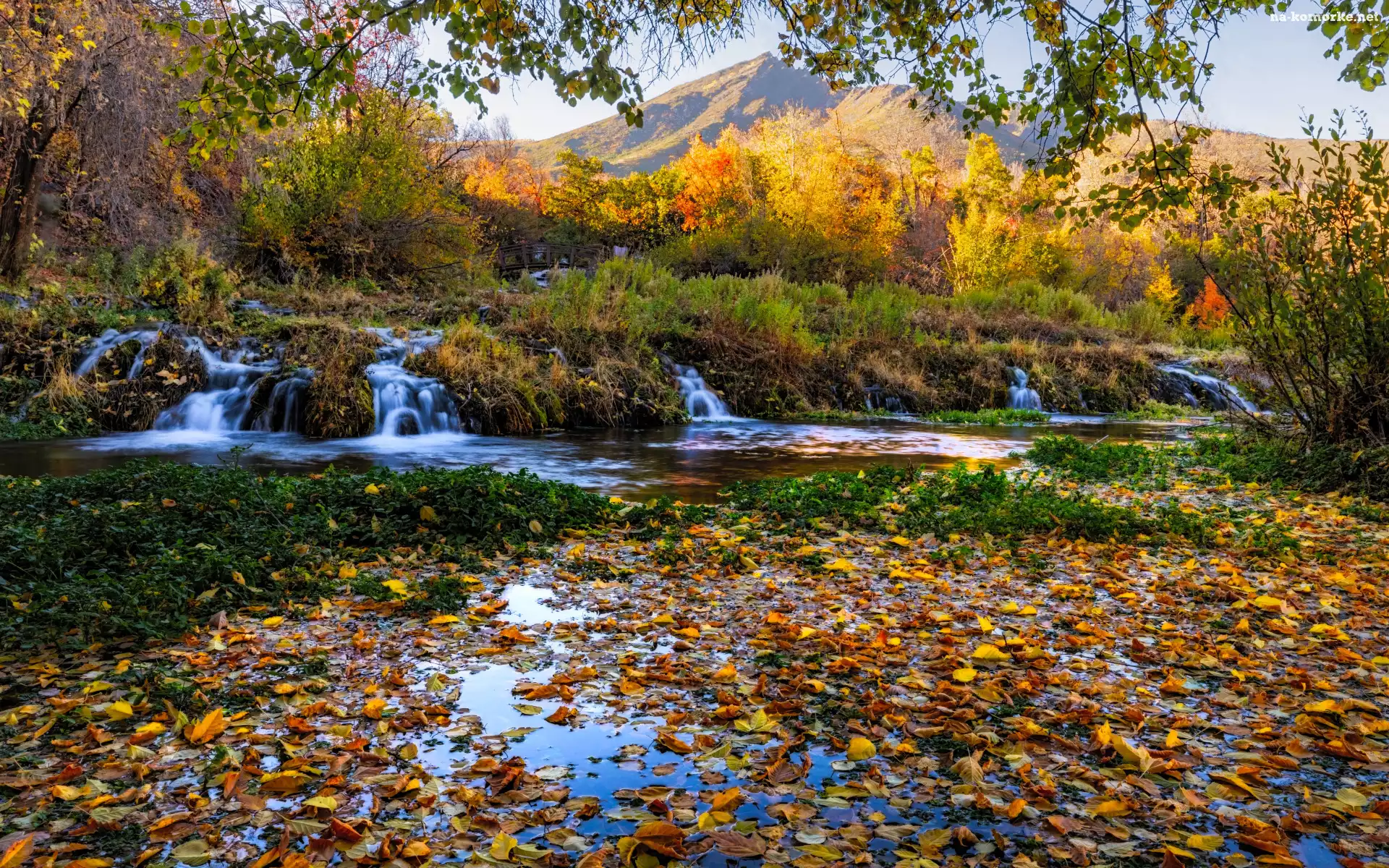 Jesień, Rzeka, Drzewa, Góry, Liście na Komórkę