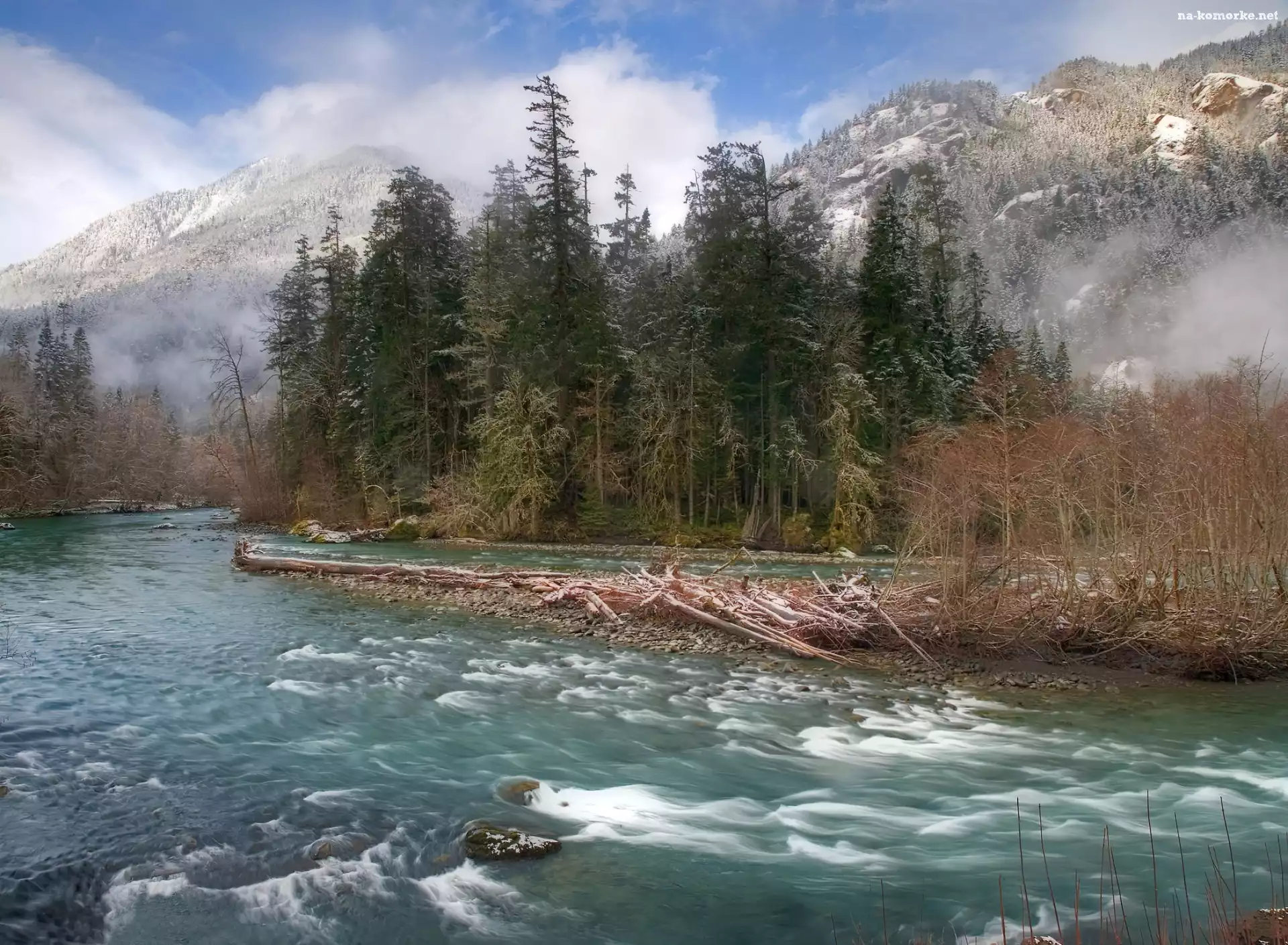 Rzeka, Mgła, Drzewa, Góry na Komórkę