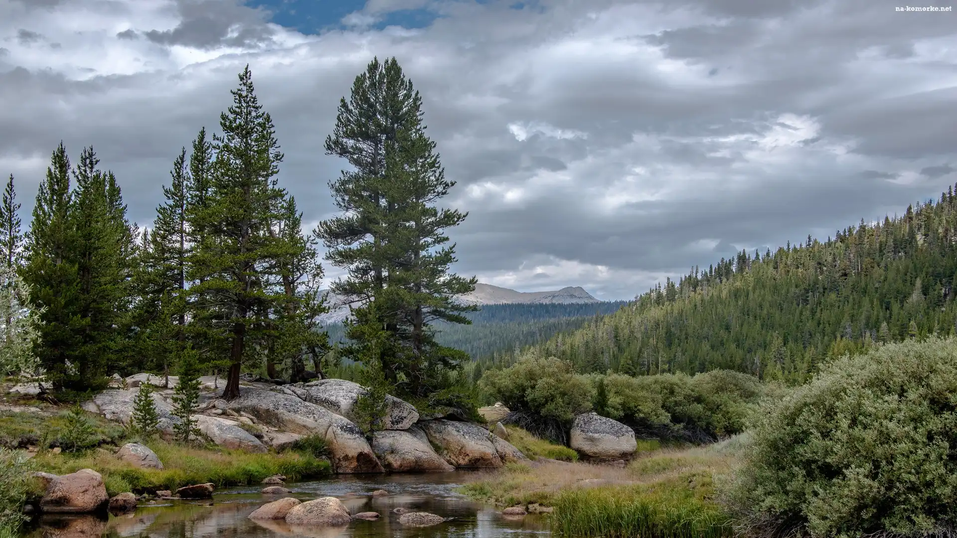 Rzeka, Kamienie, Skały, Drzewa, Góry na Komórkę
