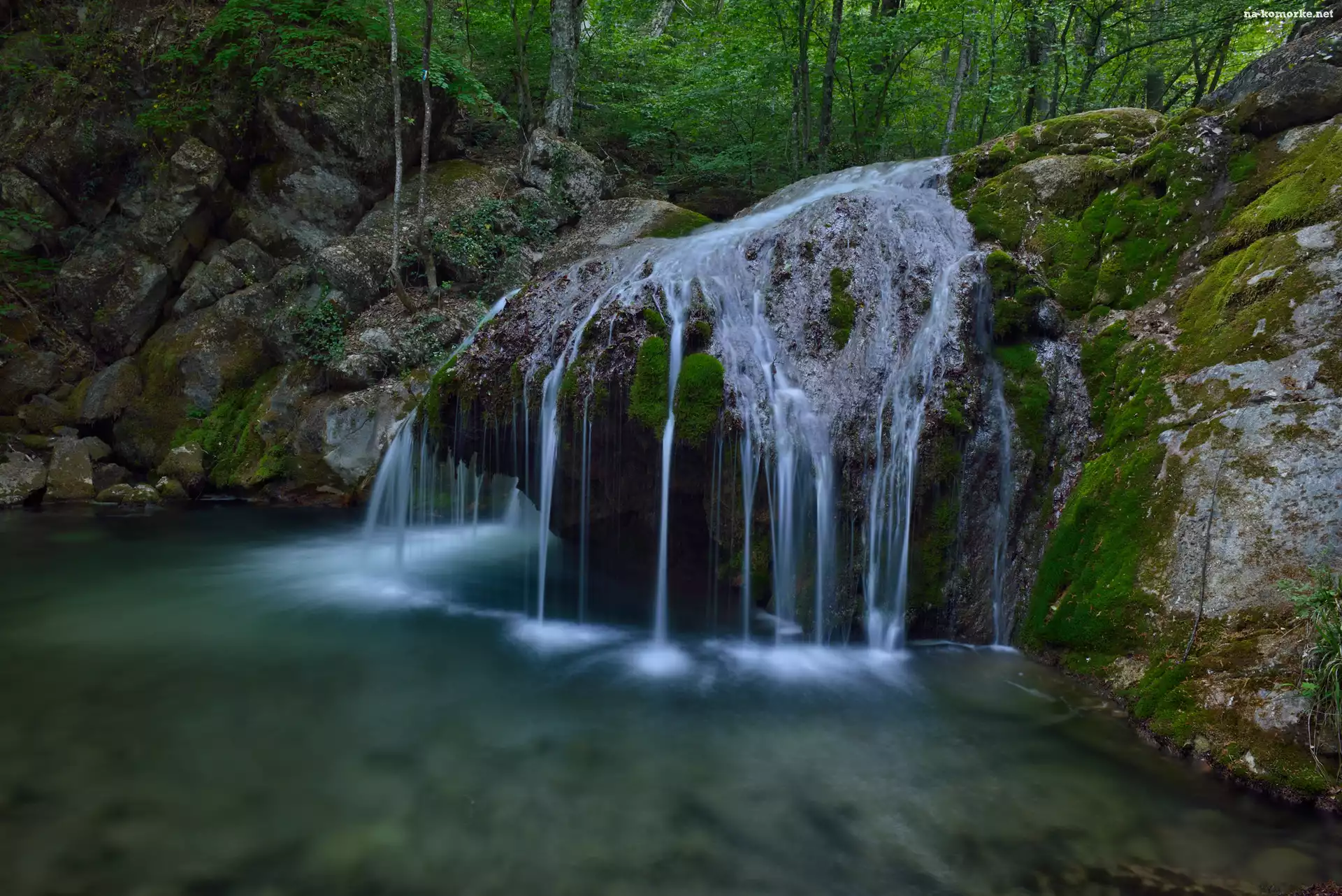 Rzeka, Las, Skały, Drzewa, Wodospad na Komórkę