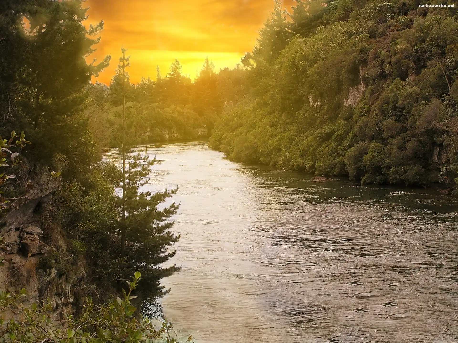 Rzeka, Słońca, Drzewa, Zachód na Komórkę