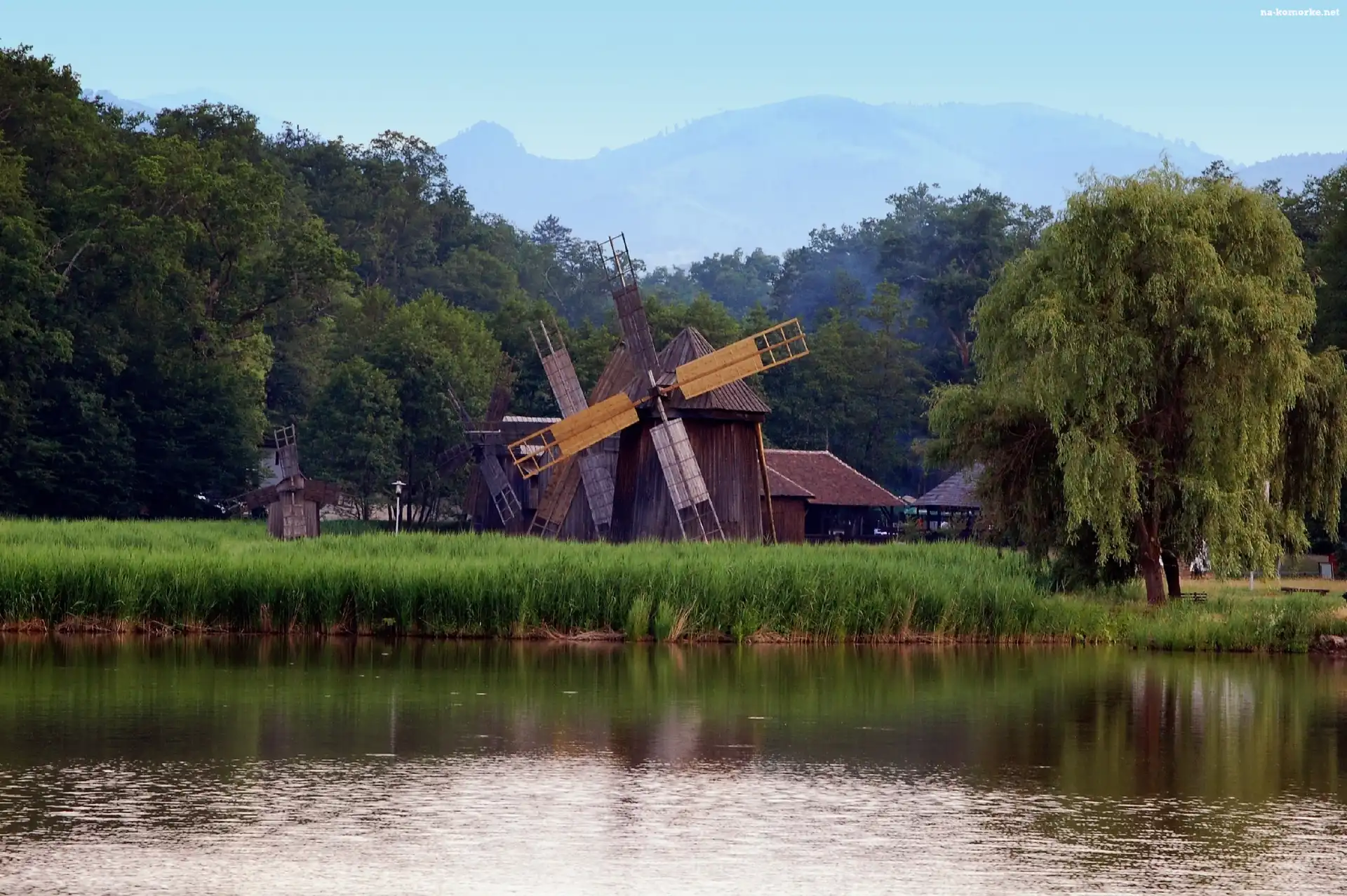 Rzeka, Wiatraki, Drzewa, Trawy na Komórkę