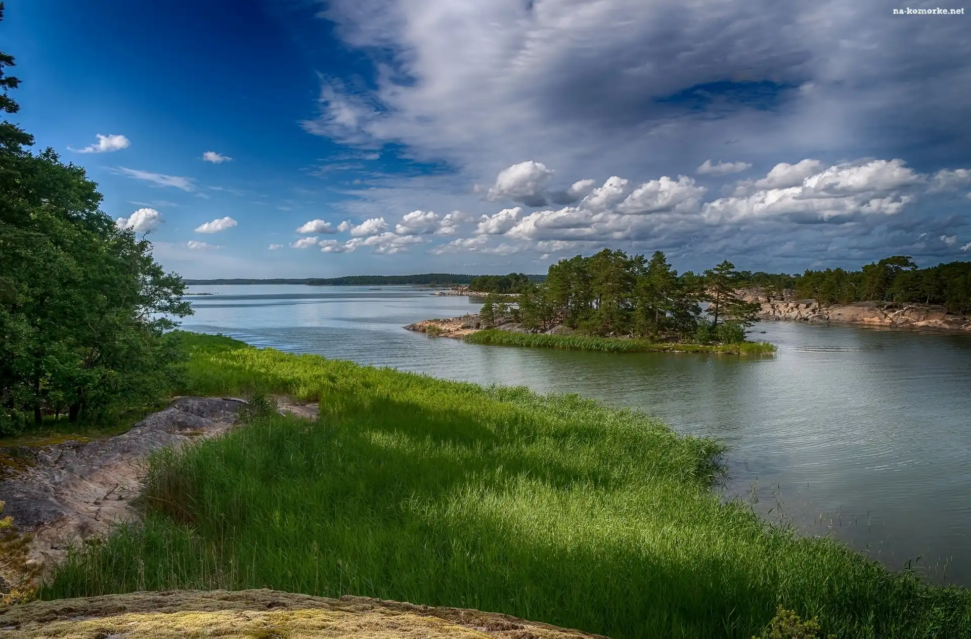 Rzeka, Wysepka, Drzewa, Trawa na Komórkę