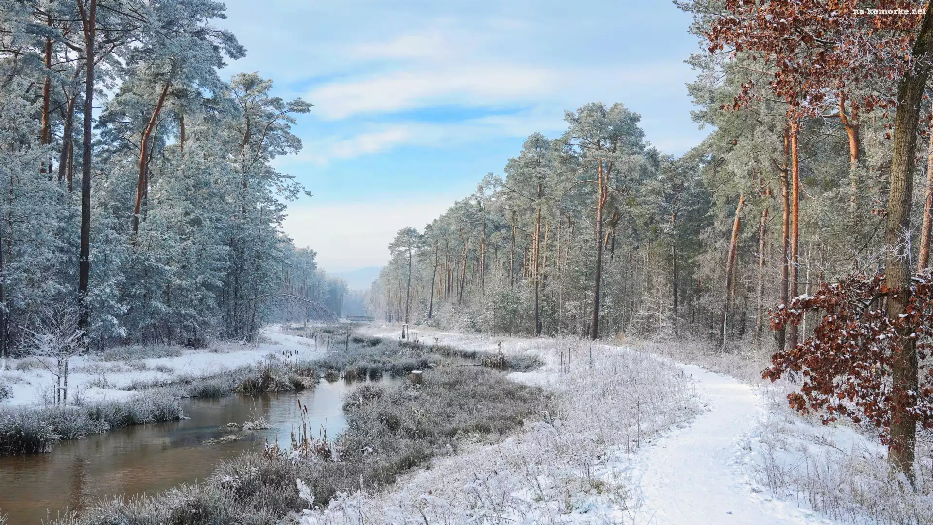 Drzewa, Trawa, Zima, Rzeka na Komórkę