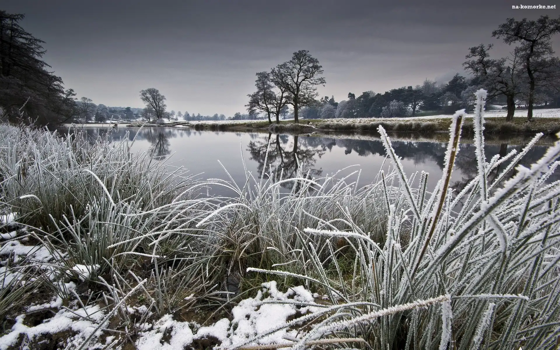 Rzeka, Zima, Drzewa, Trawy na Komórkę
