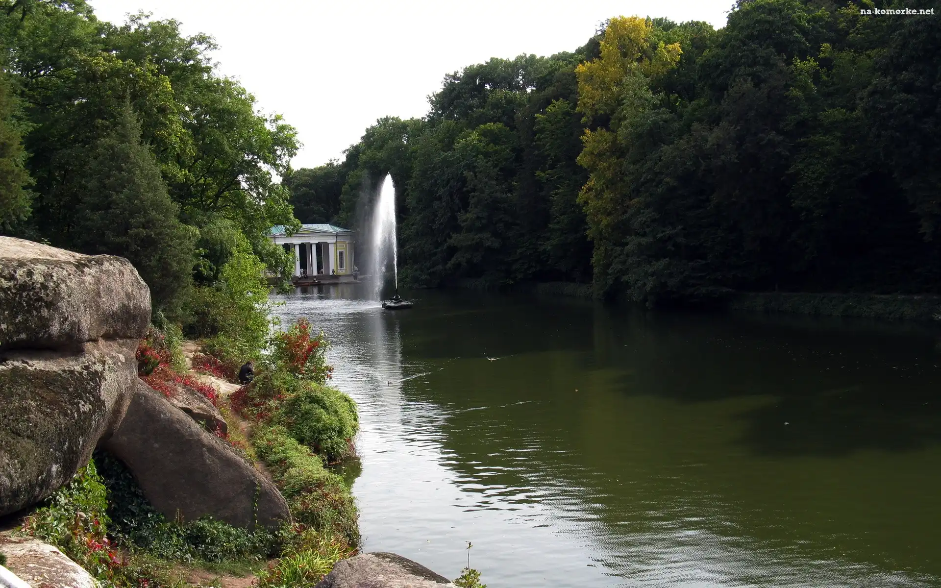 Rzeka, Park, Fontanna, Domek na Komórkę