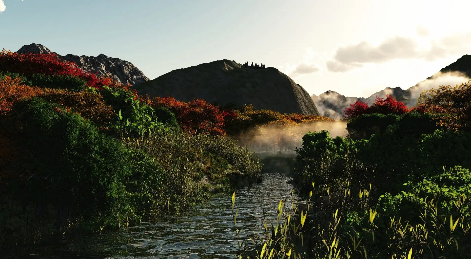 Rzeka, Mgła, Górki, Drzewa na Komórkę