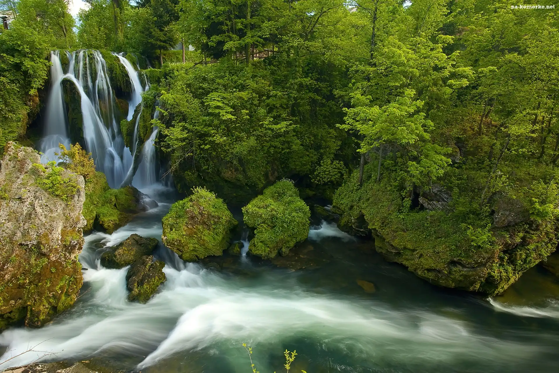 Rzeka, Drzewa, Skały, Zieleń, Górska, Wodospad na Komórkę