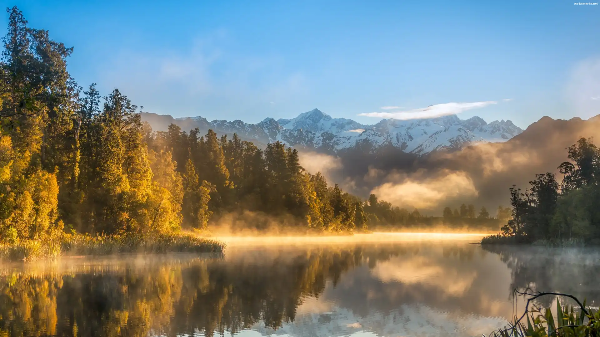 Świt, Góry, Las, Rzeka, Mgła na Komórkę