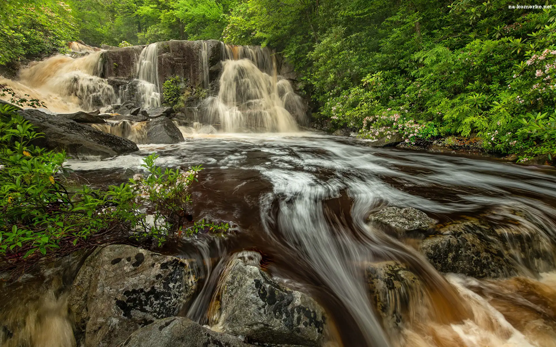 Rzeka, Wodospad, Skała, Krzewy, Kamienie, Drzewa na Komórkę