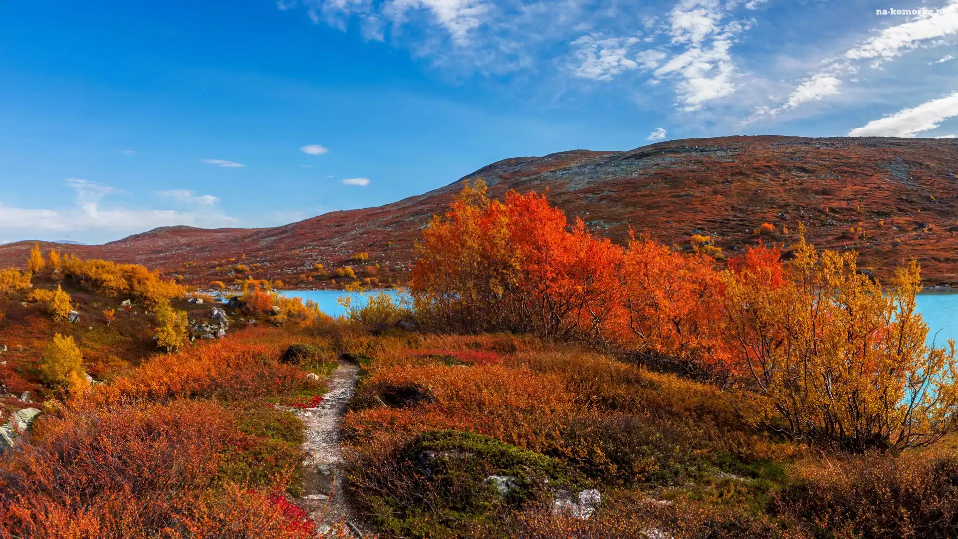 Krzewy, Jesień, Wzgórza, Rzeka na Komórkę