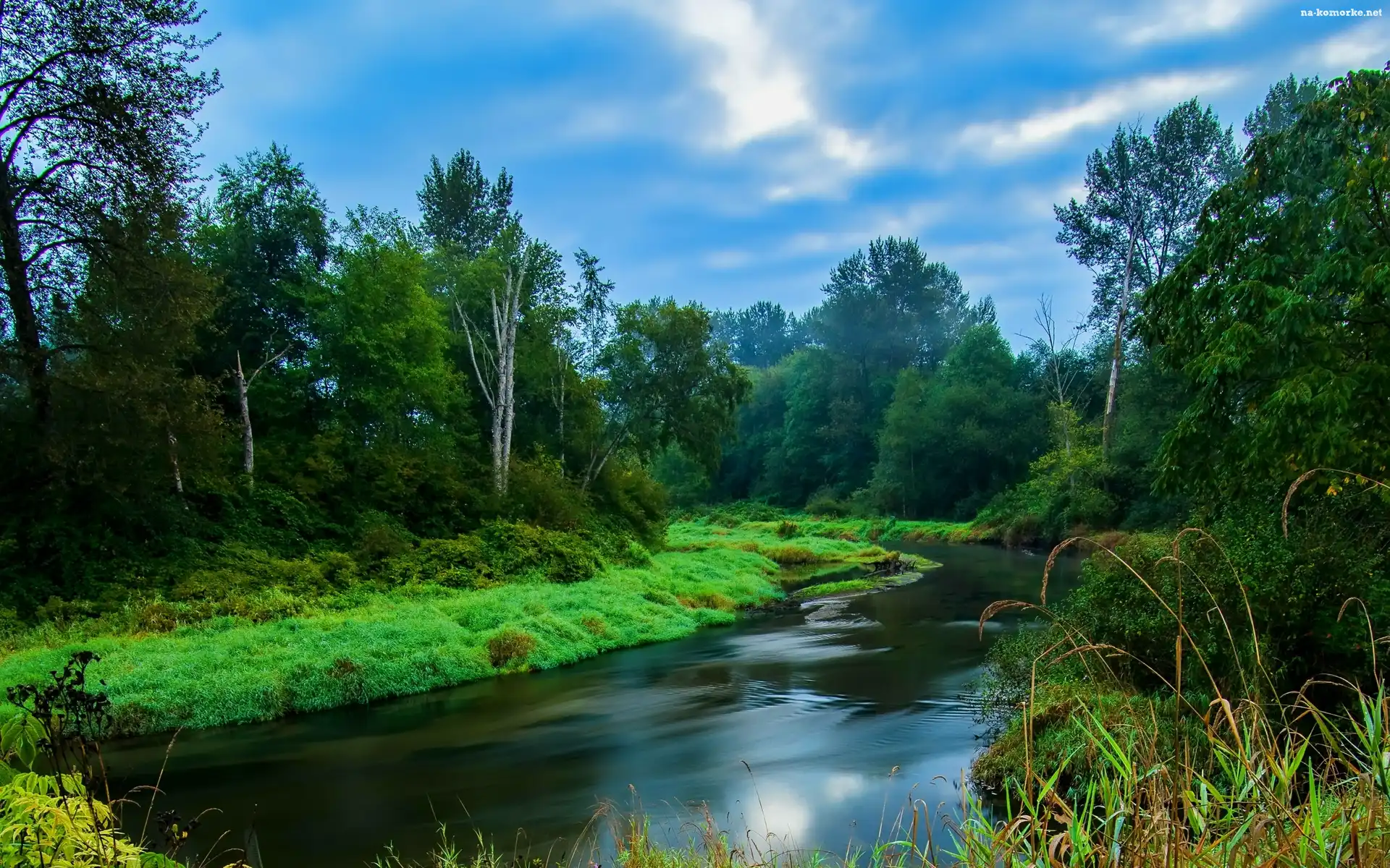 Rzeka, Chmury, Las, Trawy na Komórkę
