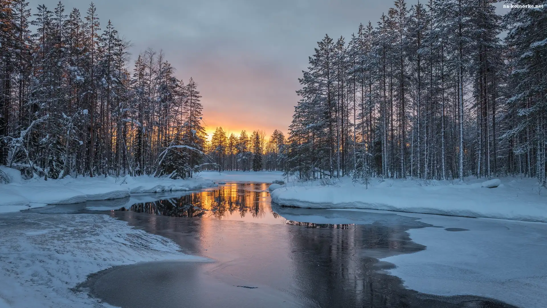 Las, Rzeka, Zima, Zachód słońca, Drzewa, Śnieg na Komórkę