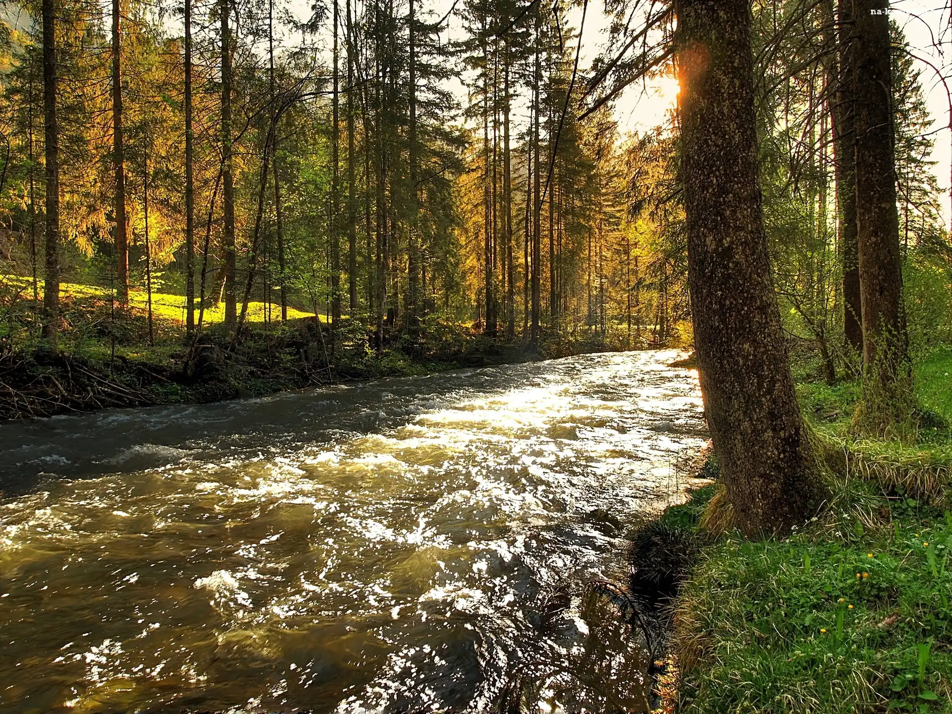 Światło, Las, Rwąca, Rzeka, Przebijające na Komórkę