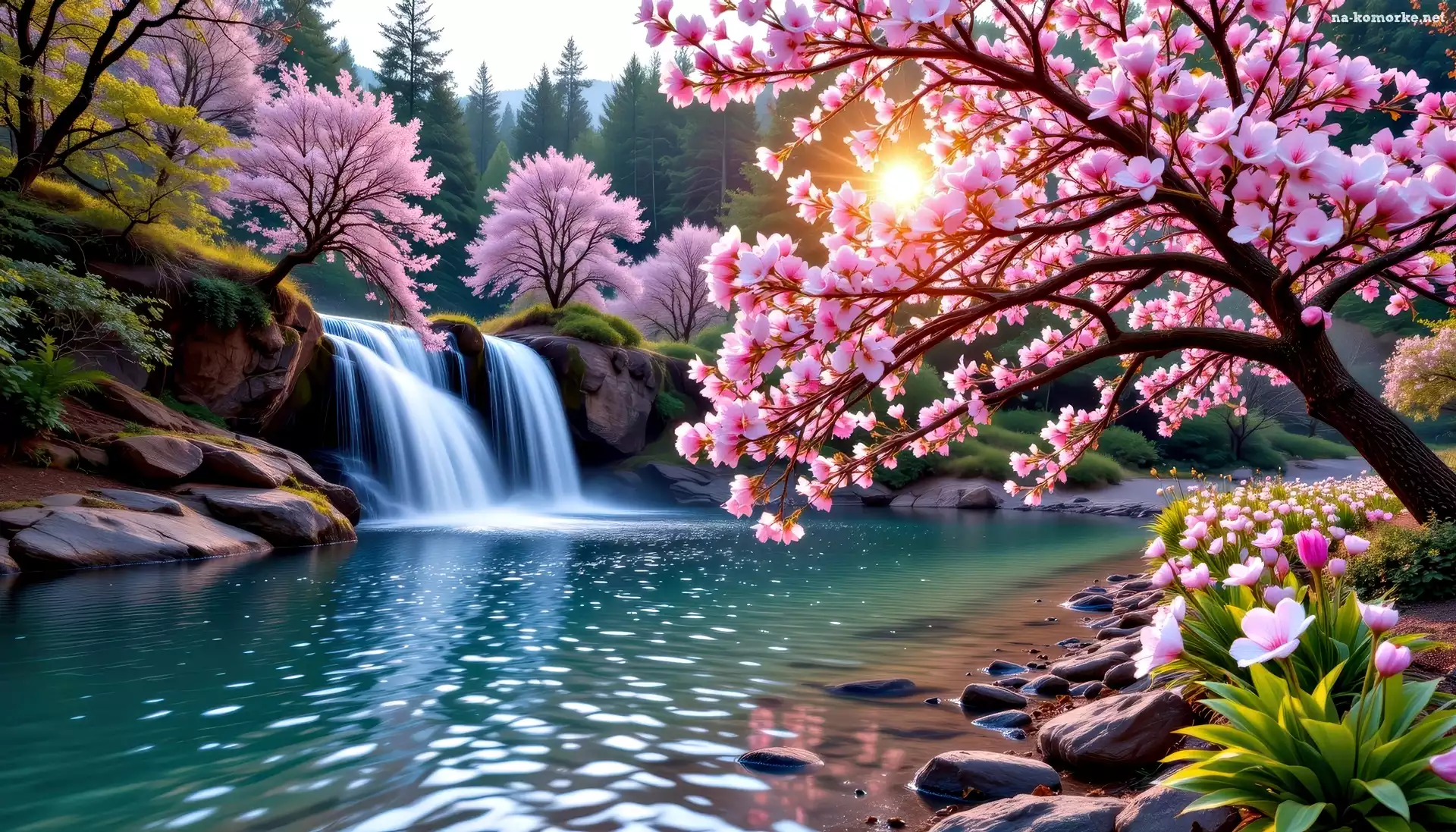 Rzeka, Zachód słońca, Kwitnące, Wiosna, Drzewa, Grafika AI, Las, Wodospad na Komórkę