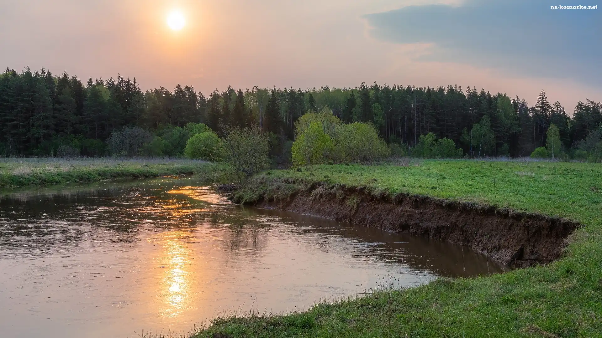 Rzeka, Zachód słońca, Las, Drzewa na Komórkę