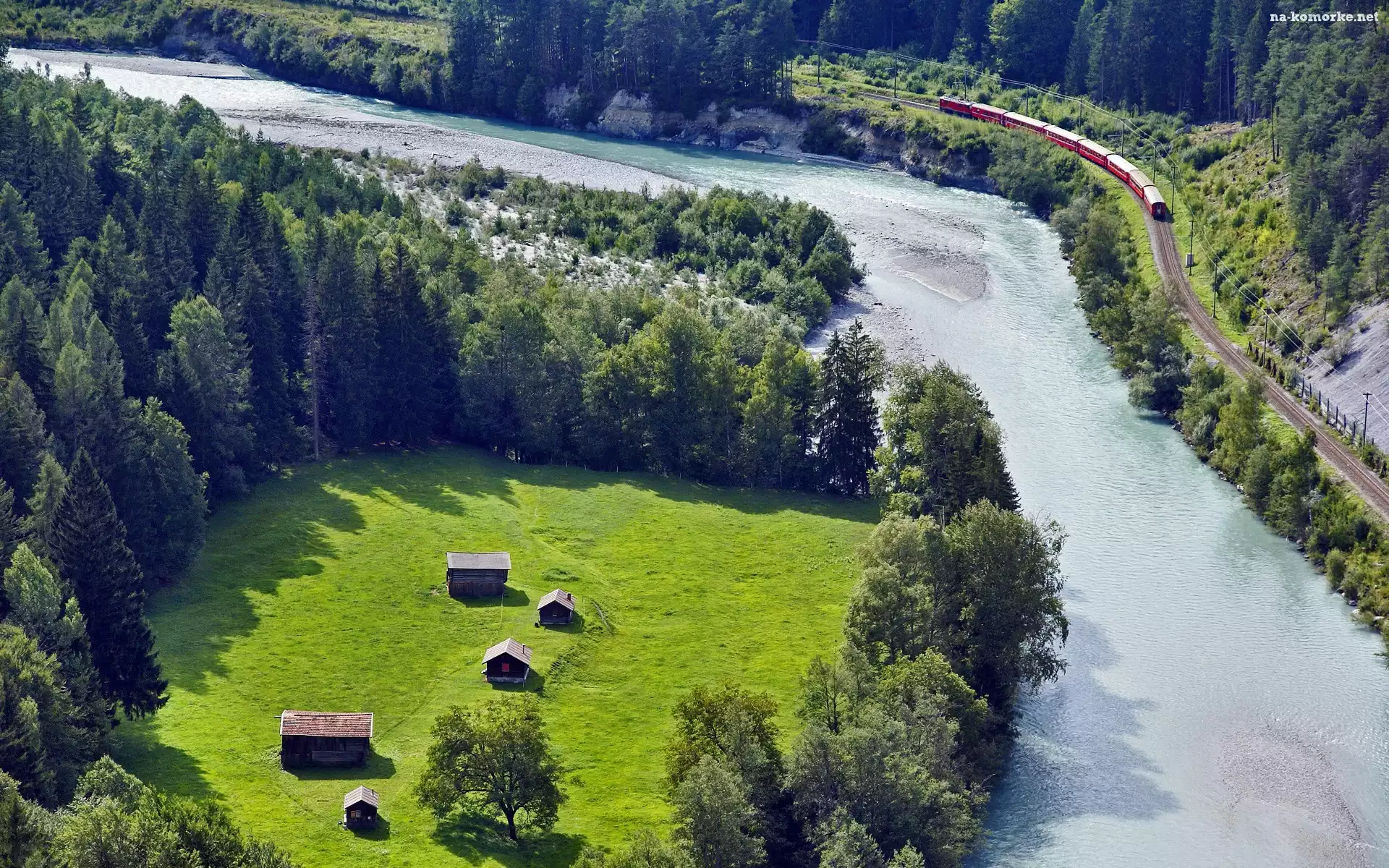 Rzeka, Domy, Lasy, Łąka na Komórkę