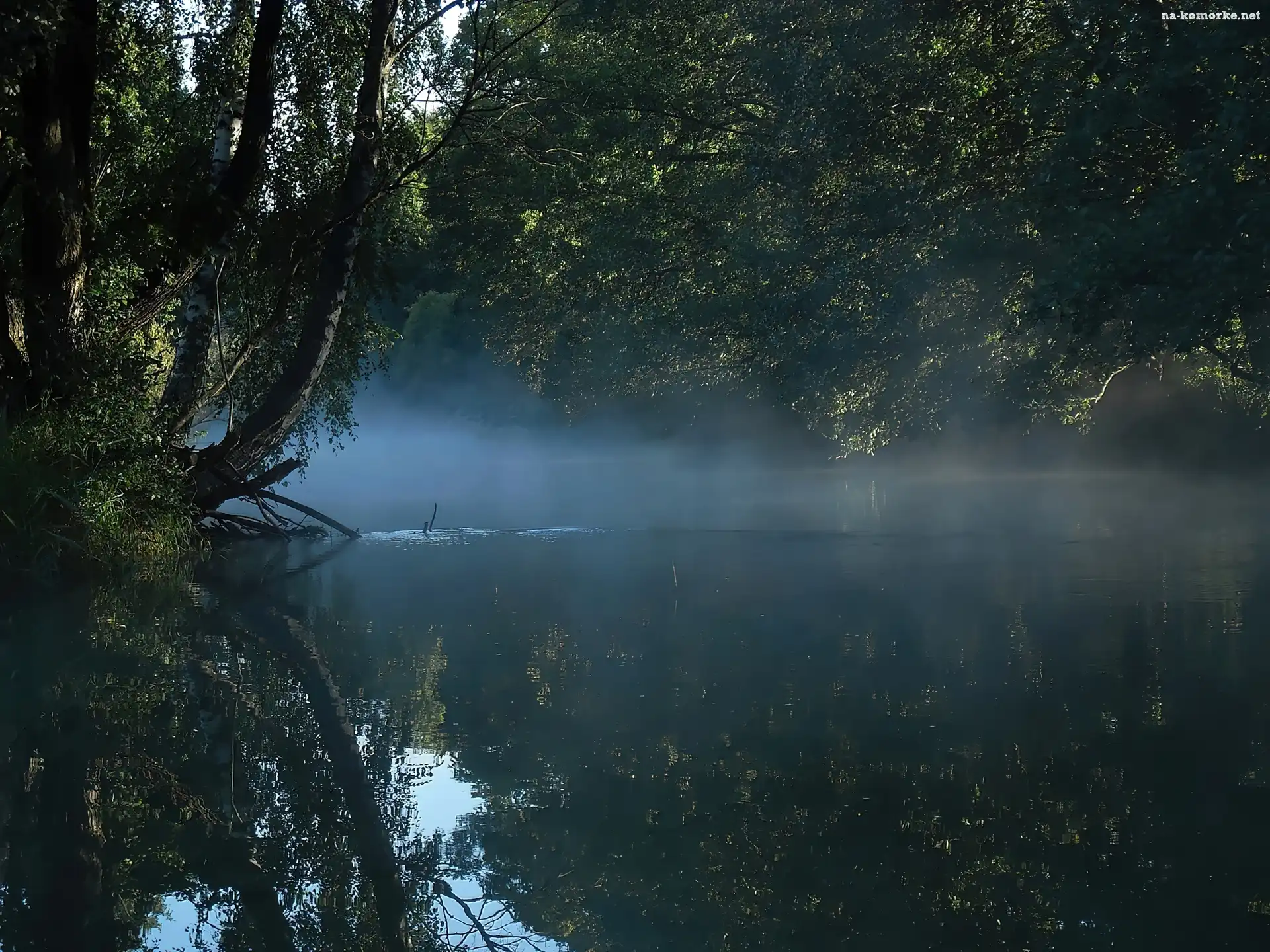 Rzeka, Liście, Mgła, Brzoza na Komórkę