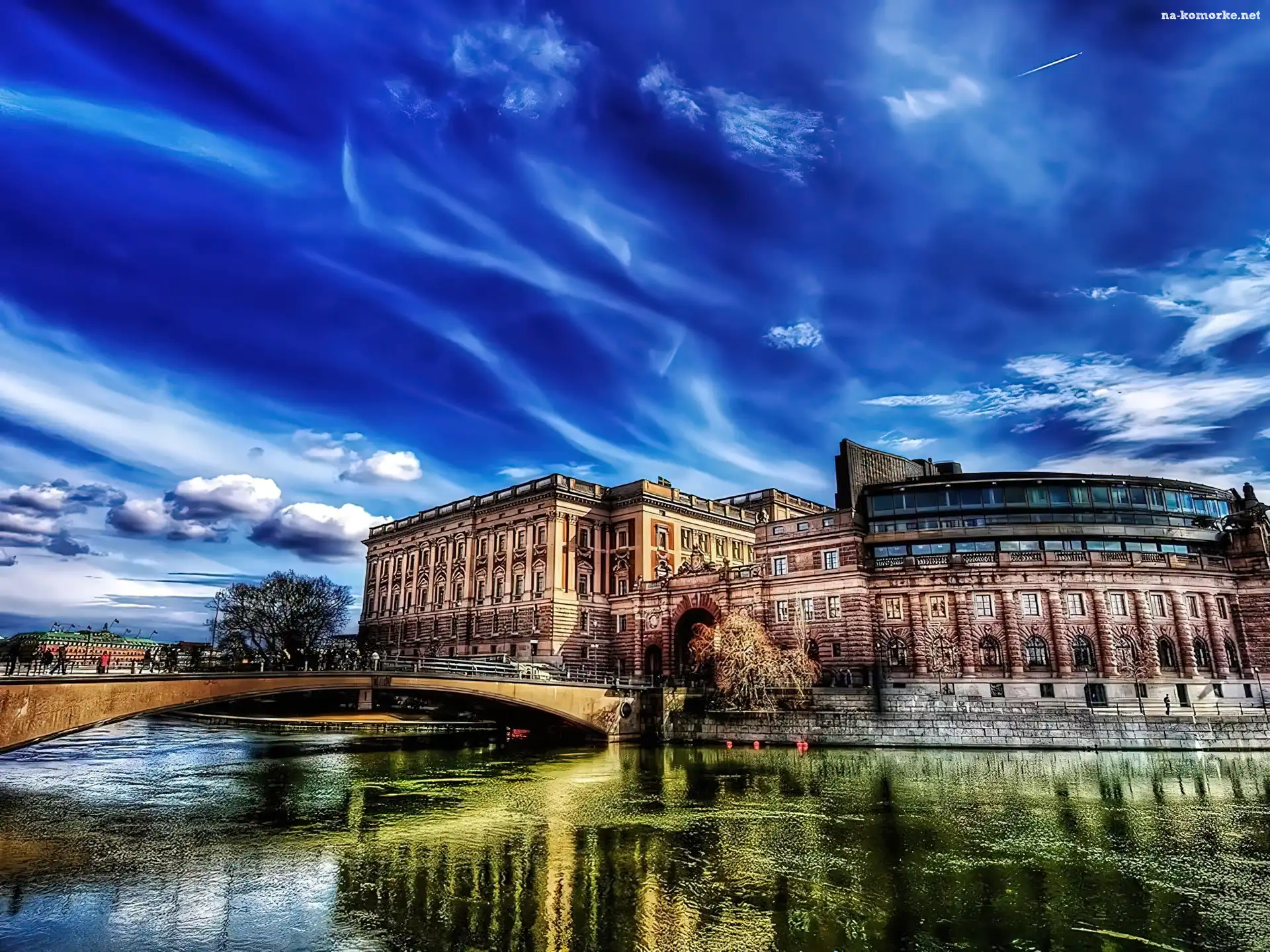 Rzeka, Chmury, Most, Budynek na Komórkę
