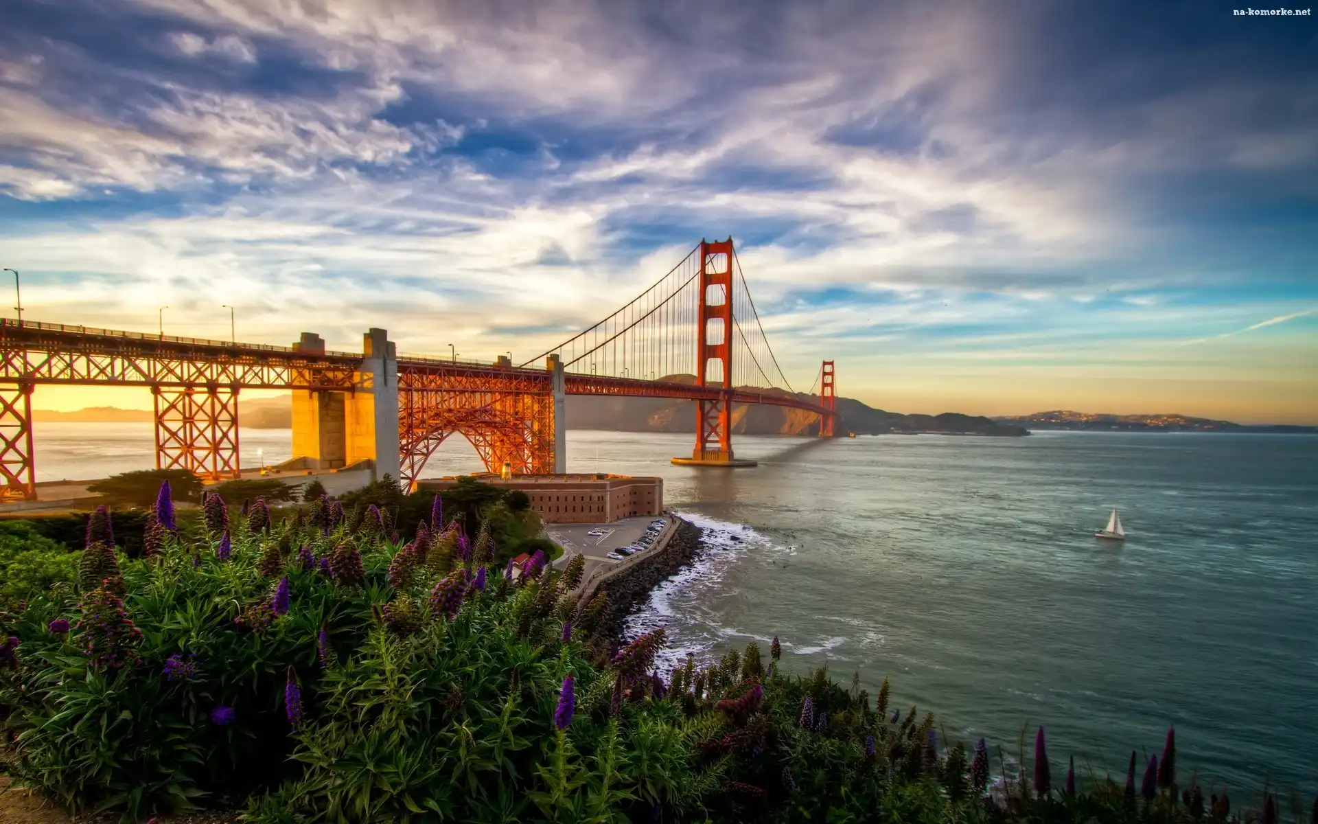 Rzeka, Kwiaty, Most, Żaglówka na Komórkę