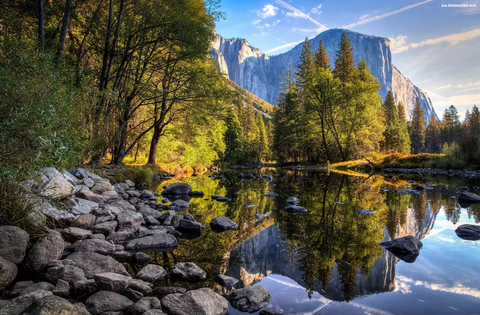 Stany Zjednoczone, Rzeka, Park Narodowy Yosemite, Odbicie, Kalifornia, Kamienie, Drzewa, Góry na Komórkę |
