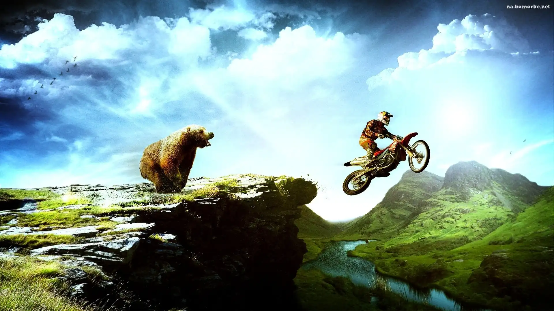 Rzeka, Ucieczka, Niedźwiedź, Motocykl na Komórkę