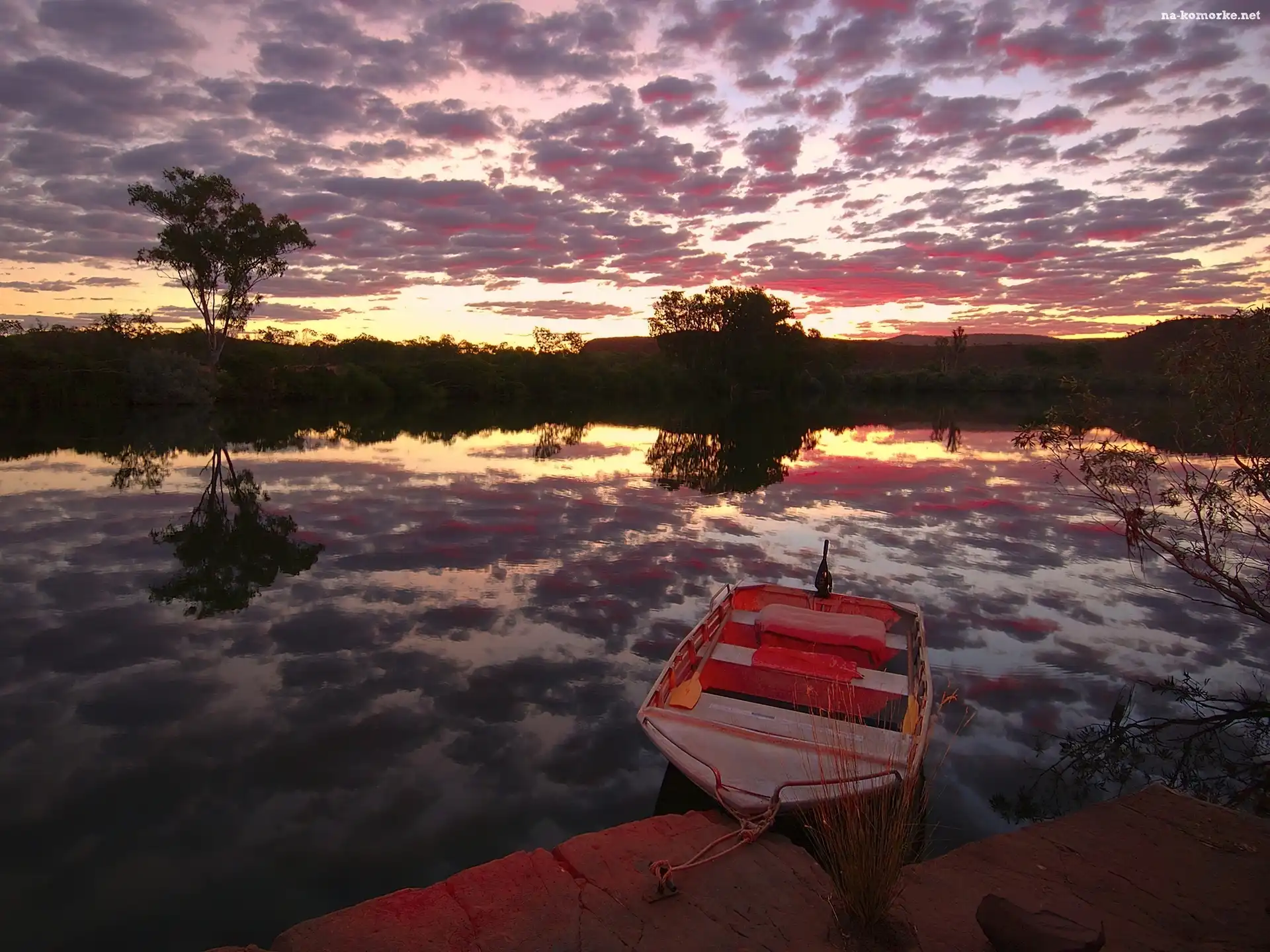 Rzeka, Drzewa, Łódka, Przystań na Komórkę
