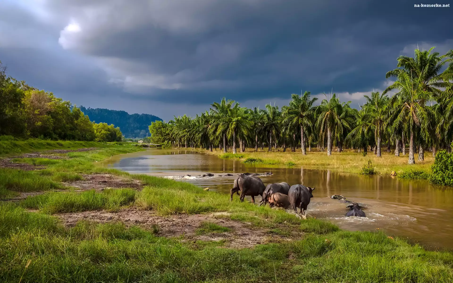 Rzeka, Kąpiel, Palmy, Zwierzęta na Komórkę