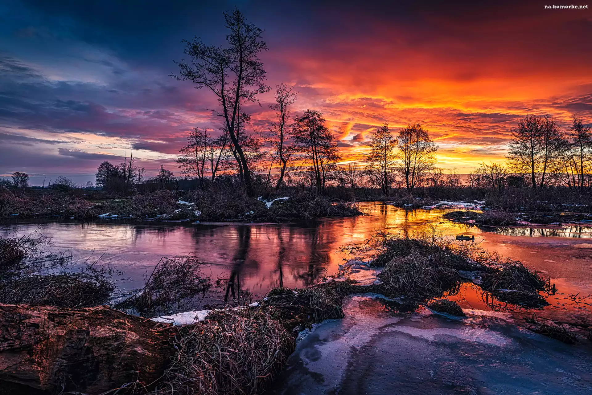 Polska, Rzeka Mroga, Trawy, Drzewa, Zachód słońca na Komórkę