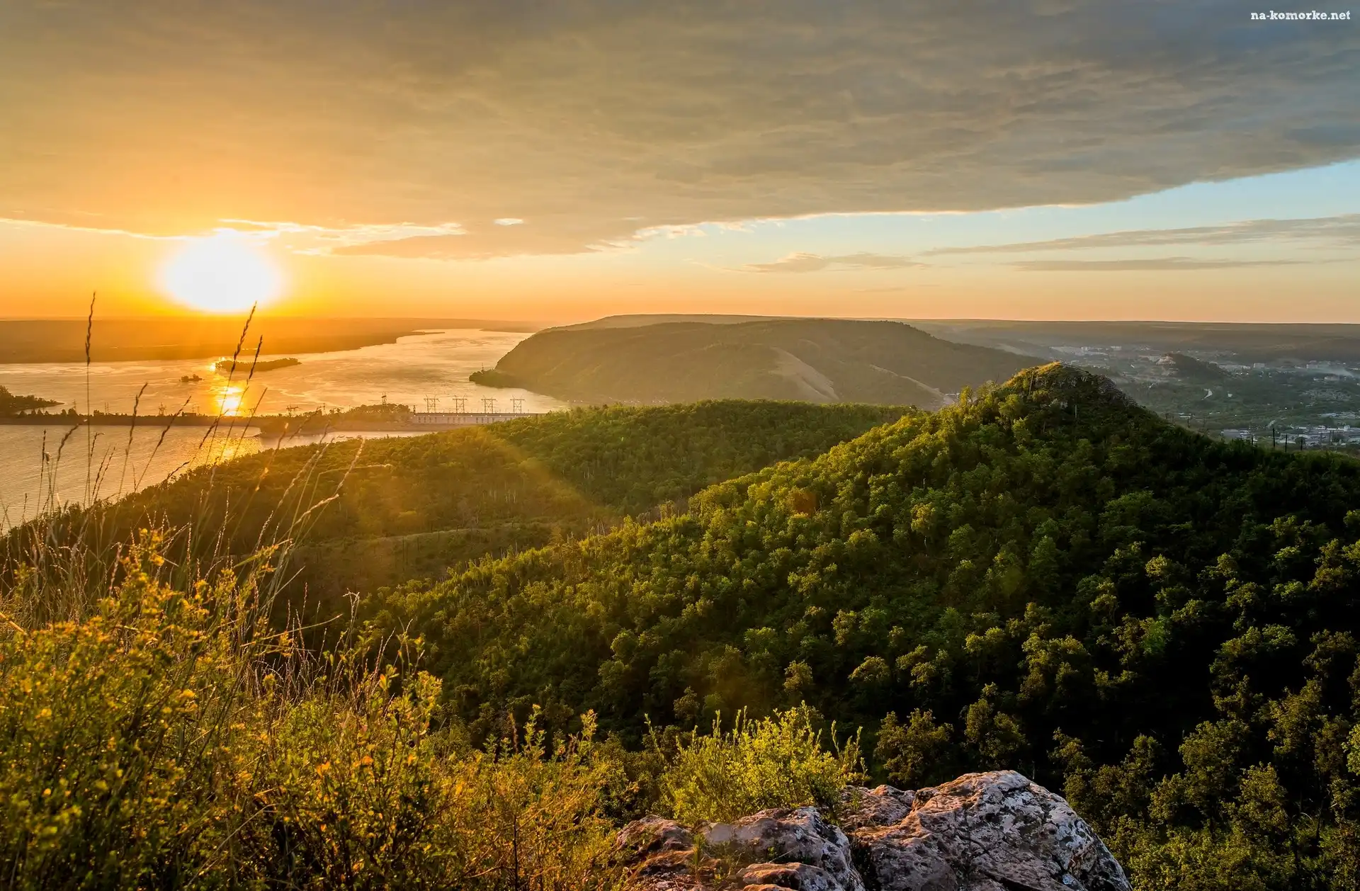 Rzeka, Drzewa, Wzgórza, Promienie Słońca na Komórkę