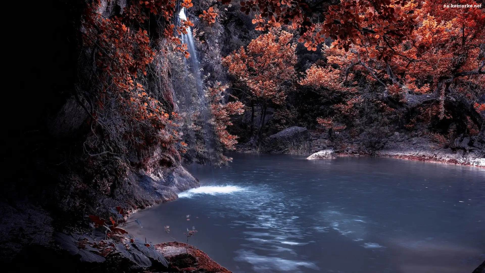 Rzeka, Drzewa, Jesień, Skała, Wodospad na Komórkę
