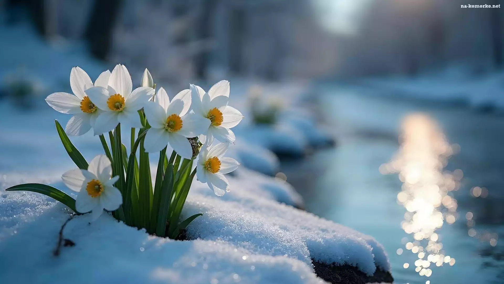 Narcyzy, Zima, Białe, Rzeka, Kwiaty, Śnieg na Komórkę