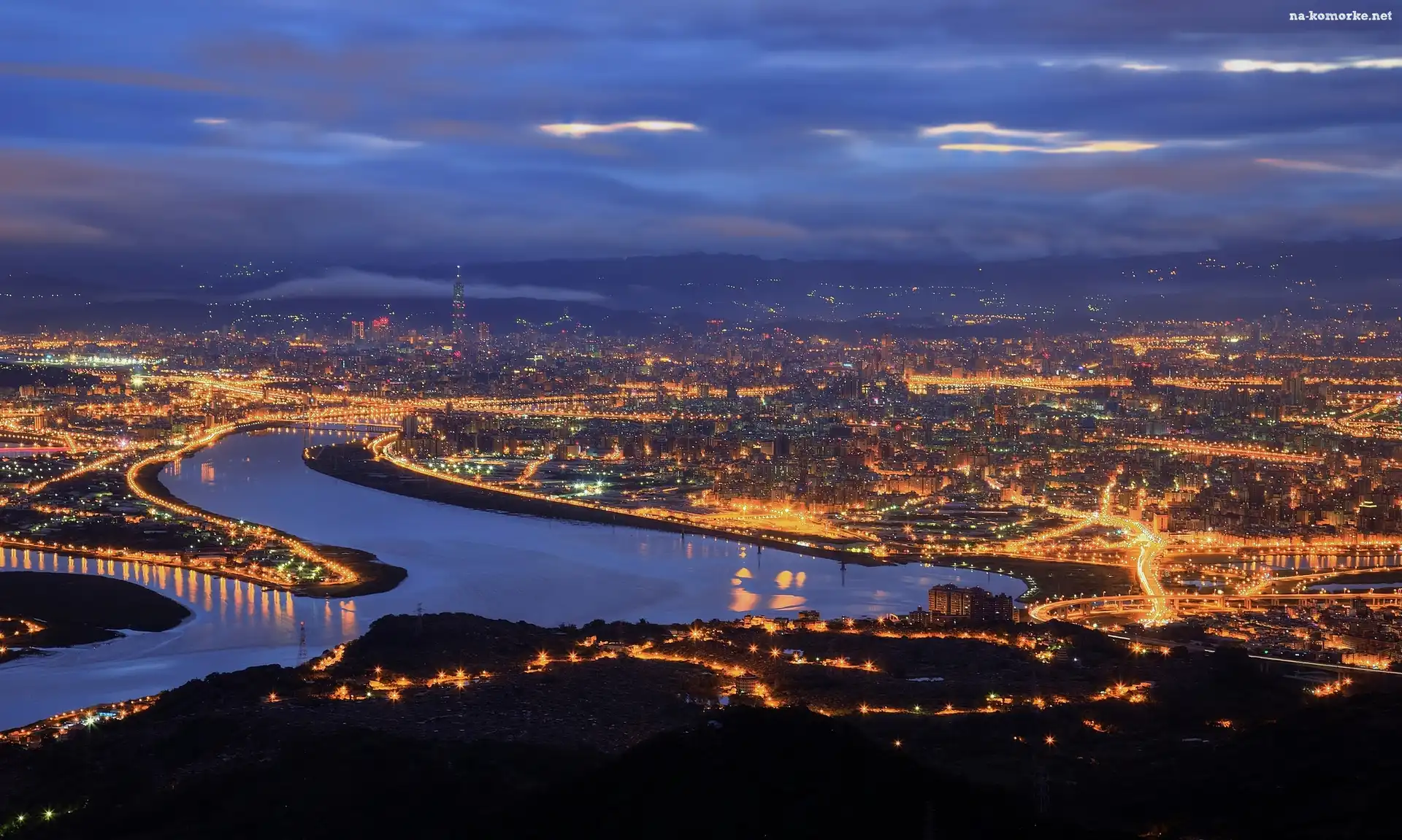 Tajwan, Rzeka Danshui He, Tajpej, Miasto nocą na Komórkę