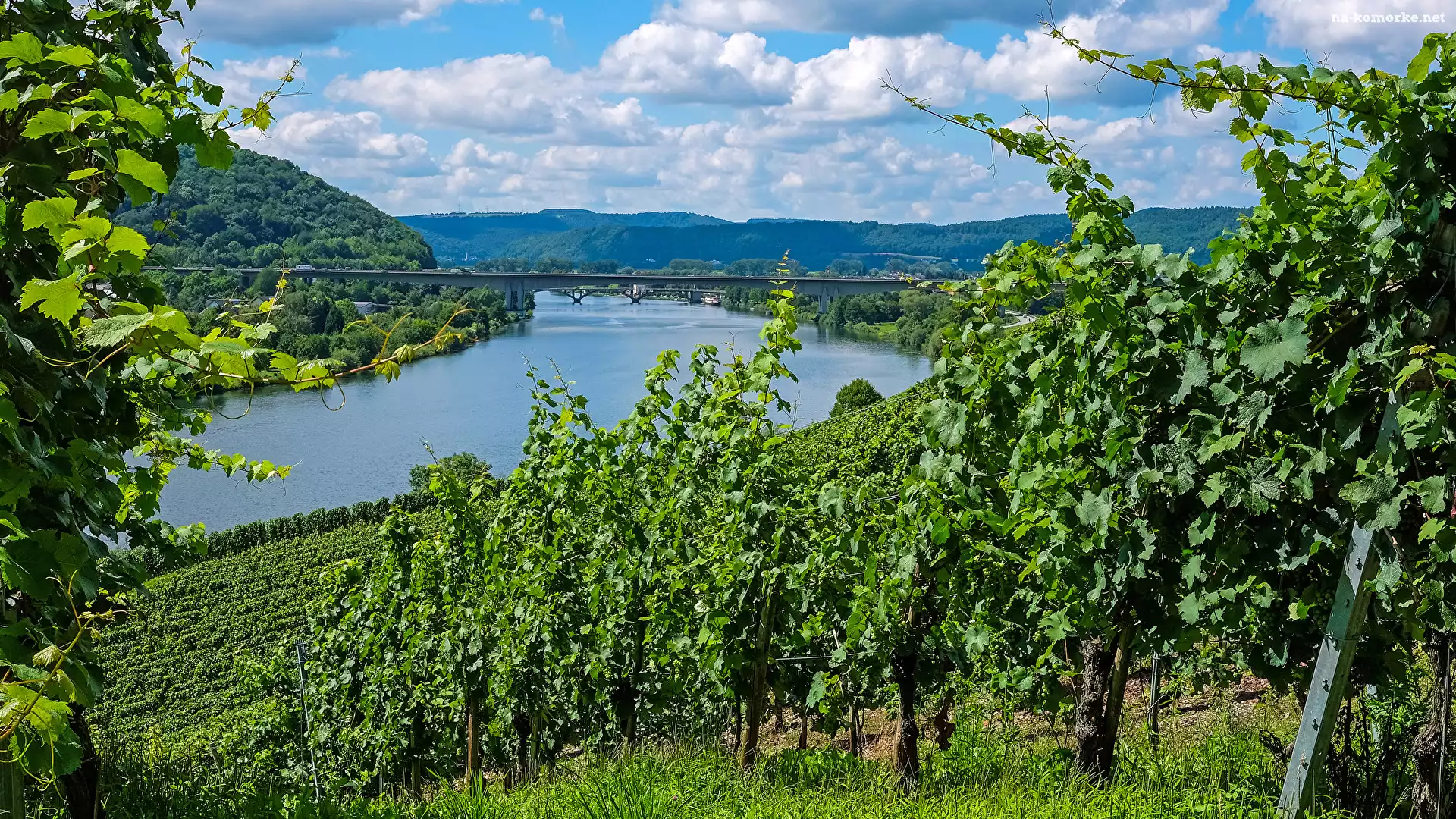 Wzgórza, Rzeka Mozela, Niemcy, Winorośla, Most, Winnice na Komórkę