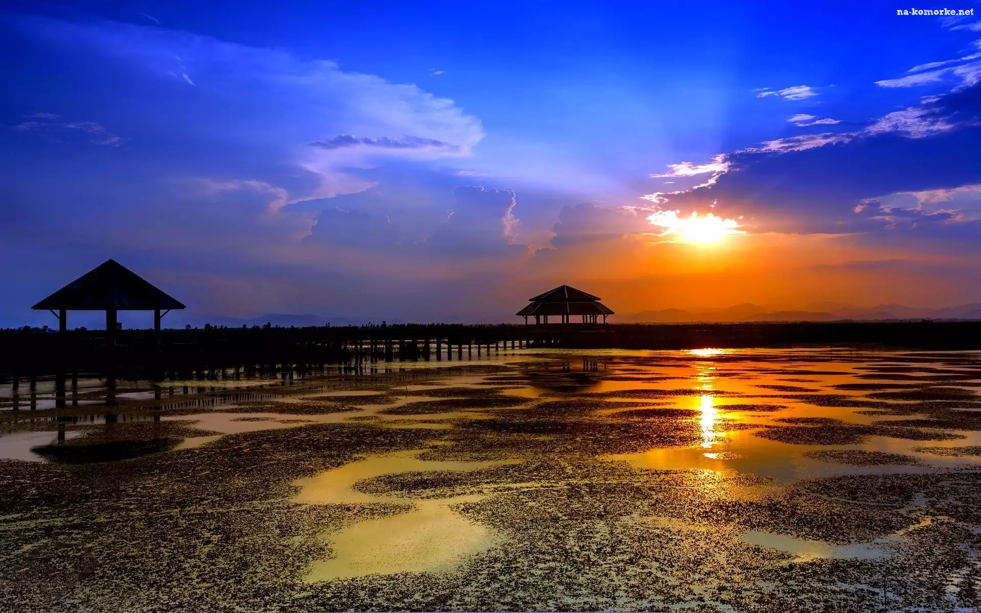 Rzeka, Pomost, Zachód, Słońca na Komórkę