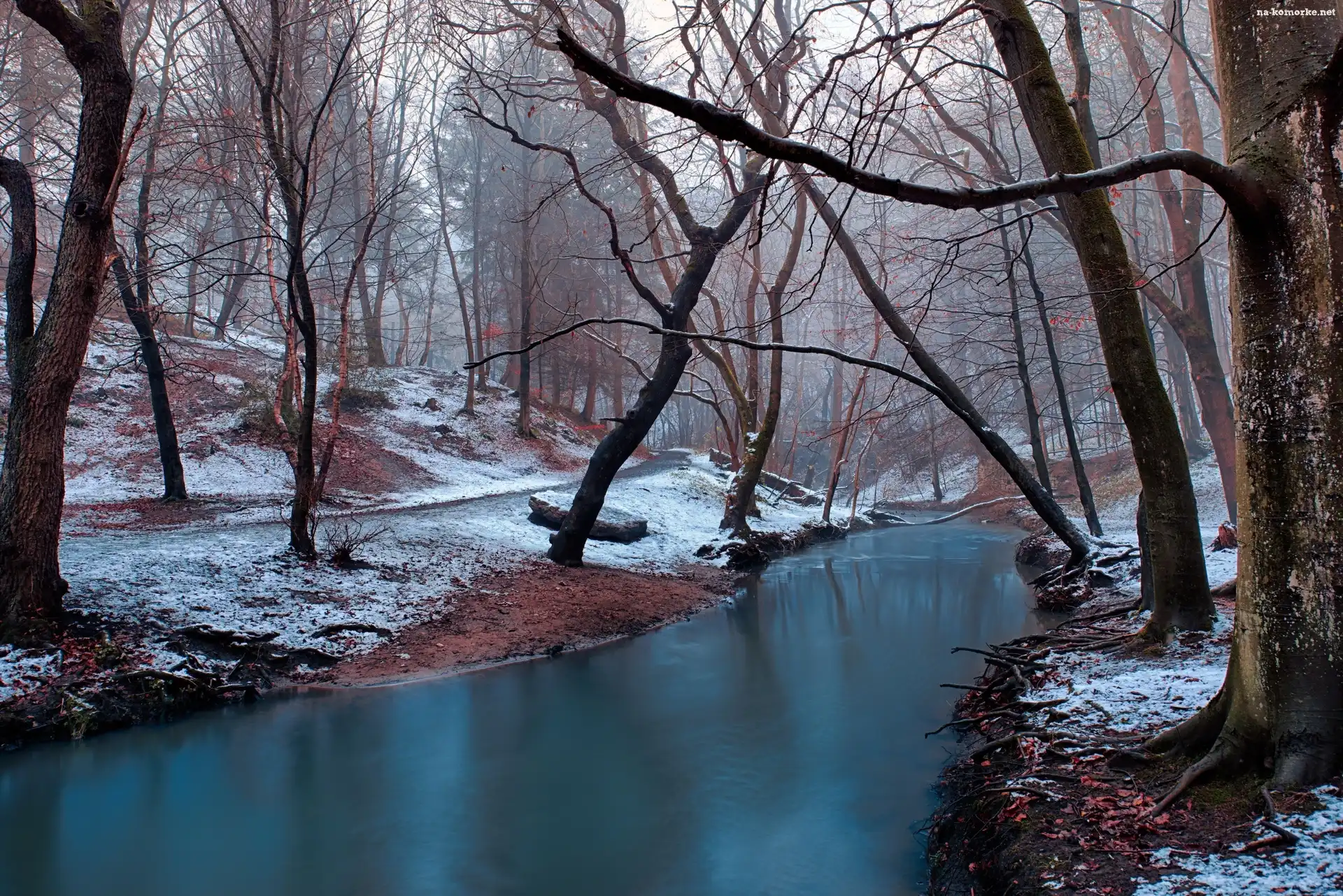 Rzeka, Drzewa, Zima, Śnieg na Komórkę