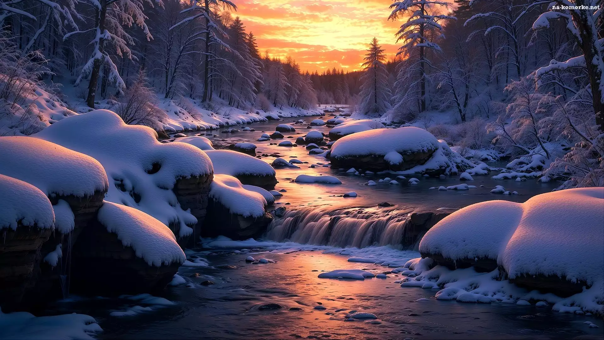 Ośnieżone, Drzewa, Zima, Śnieg, Uskok, Zachód słońca, Rzeka na Komórkę