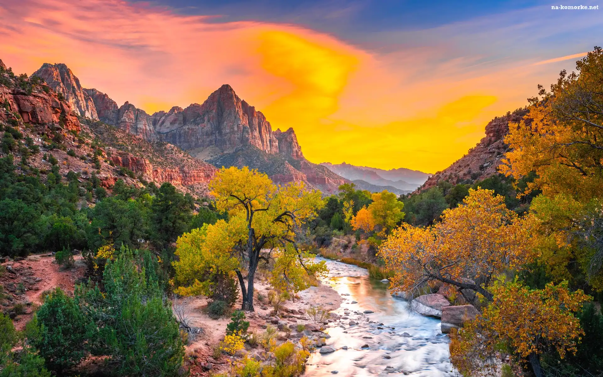 Rzeka Virgin River, Park Narodowy Zion, Jesień, Kamienie, Stany Zjednoczone, Góry Watchman, Stan Utah, Drzewa, Zachód słońca na Komórkę |