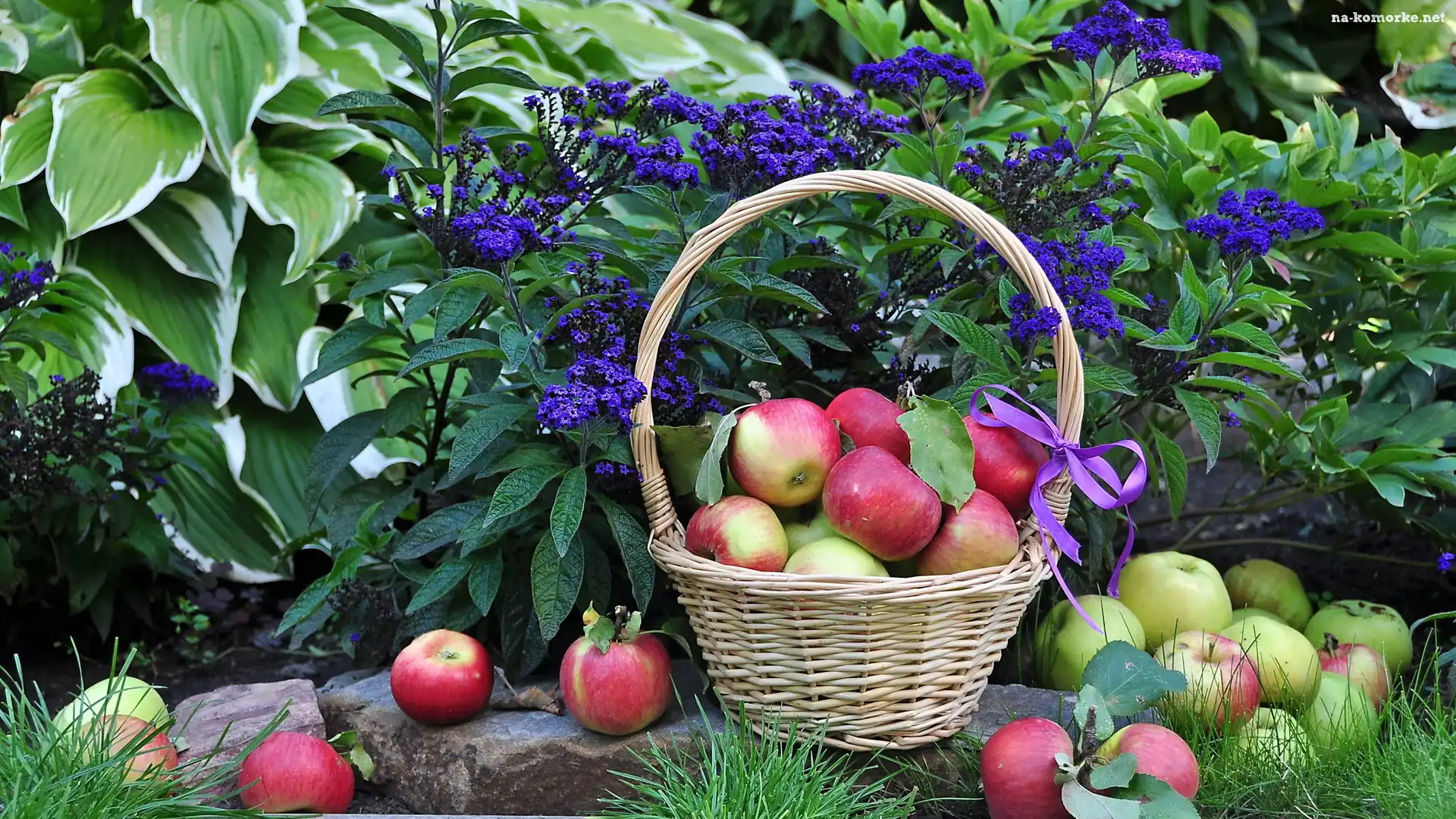 Sad, Kosz, Jabłek, Kamienie, Kwiaty na Komórkę