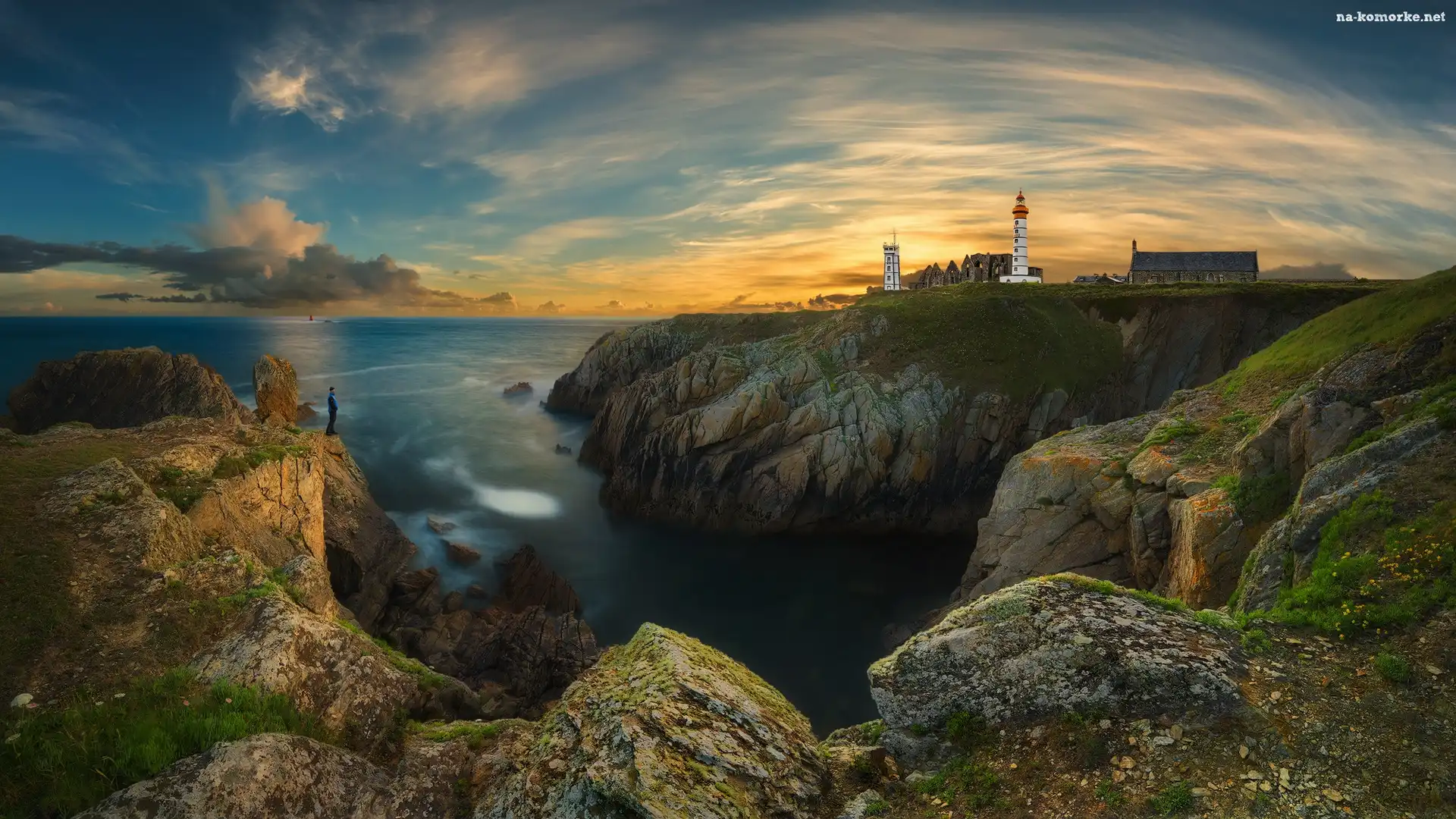 Latarnia morska Saint-Mathieu, Bretania, Francja, Morze, Skały, Zachód słońca, Plougonvelin na Komórkę |