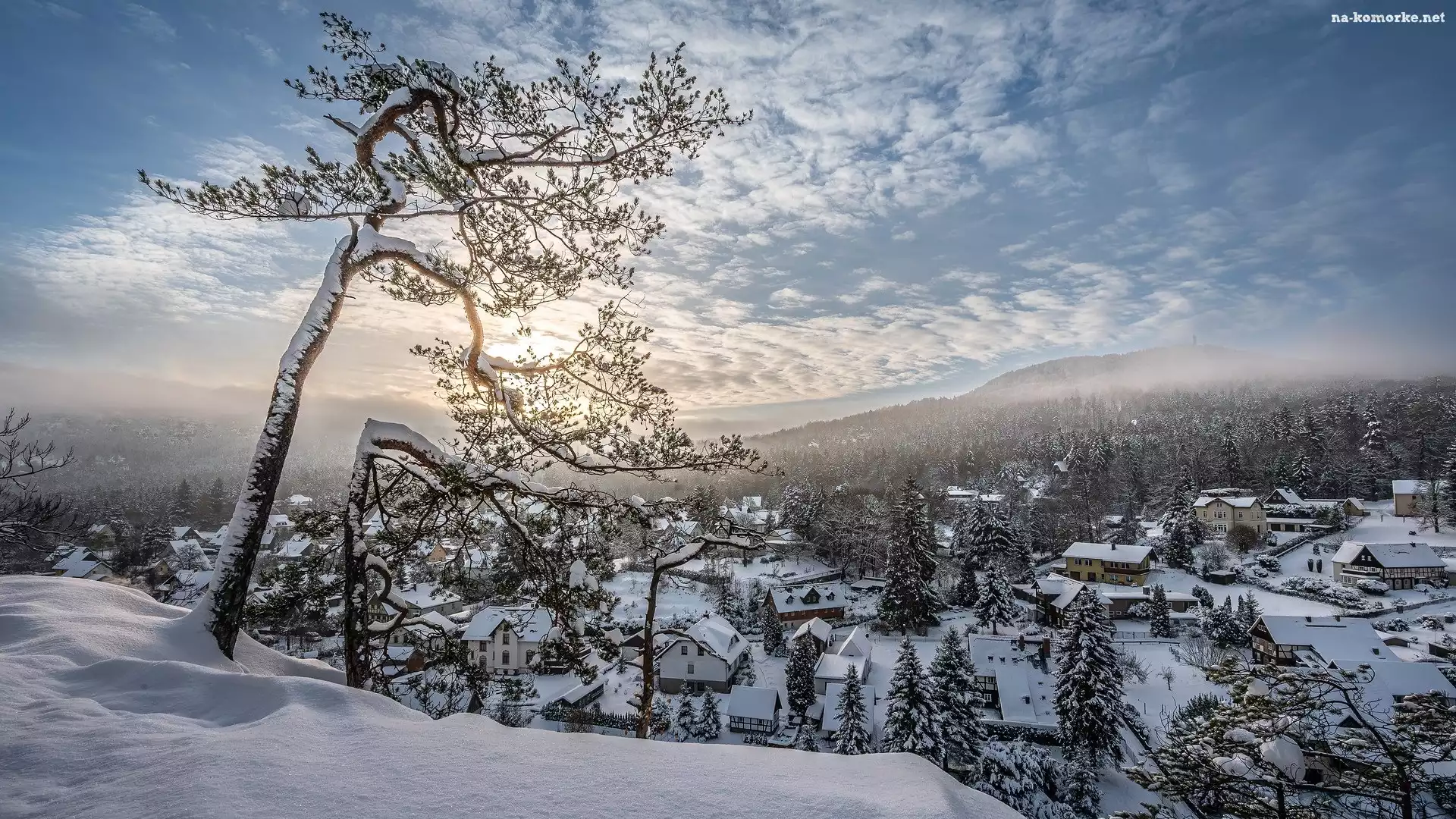 Saksonia, Oybin, Góry, Miejscowość, Mgła, Zima, Drzewa, Śnieg, Domy, Niemcy na Komórkę