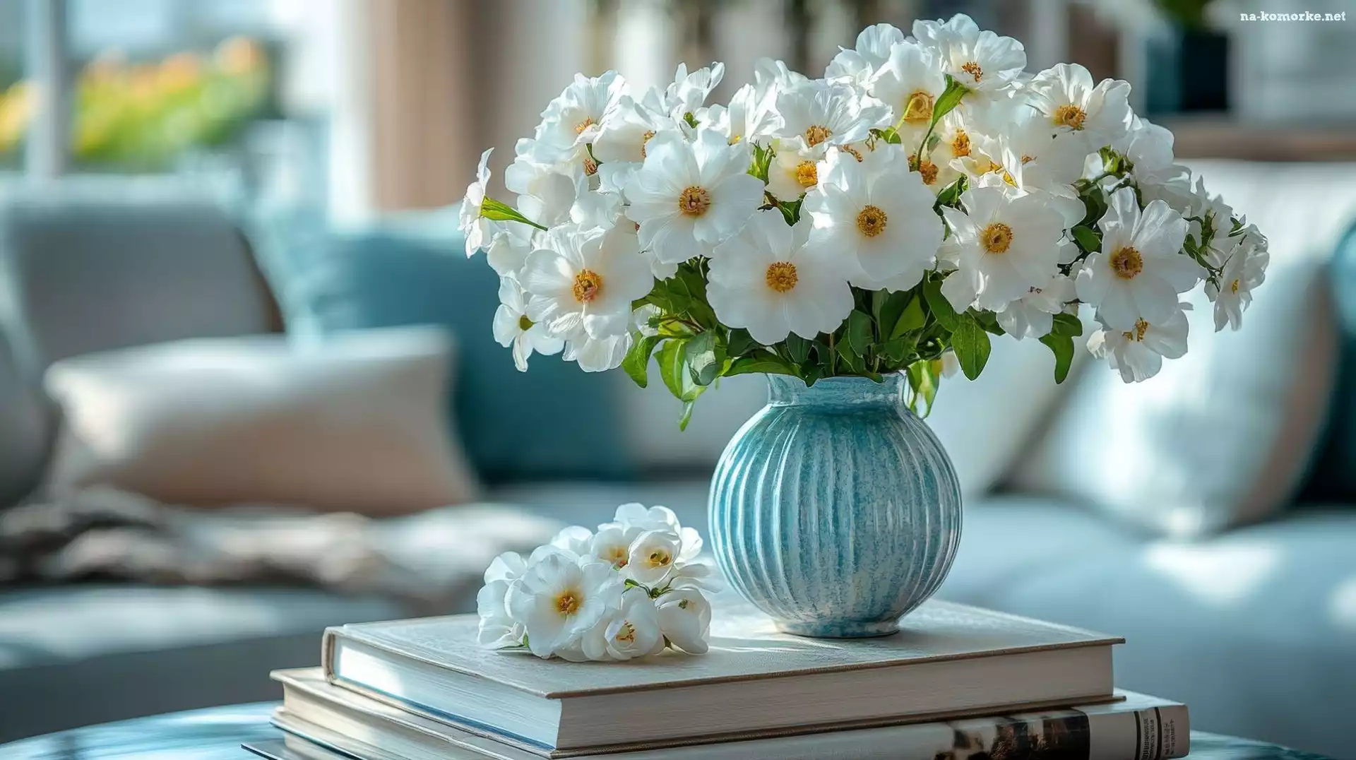 Książki, Kwiaty, Wazon, Salon, Zawilce, Białe na Komórkę