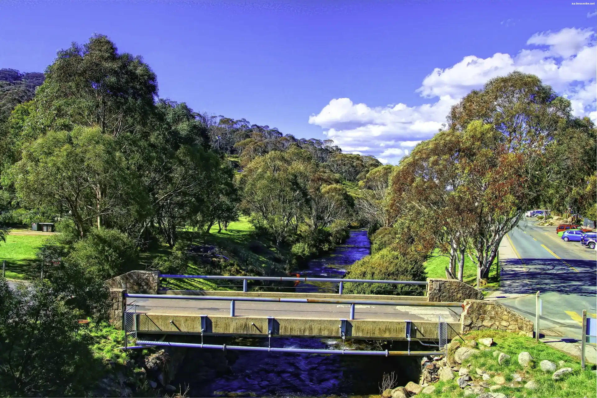 Samochody, Rzeczka, Most, Drzewa, Droga na Komórkę