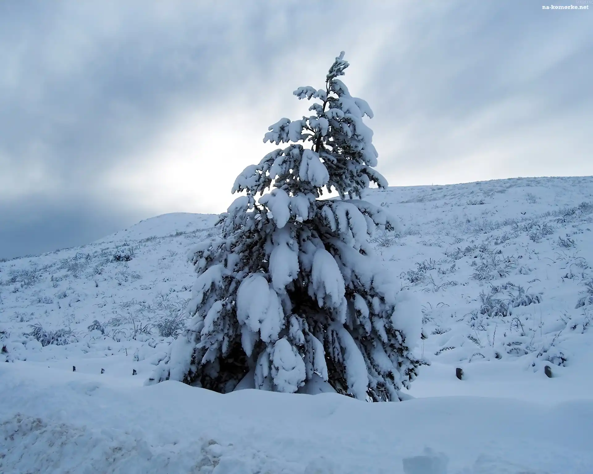 Samotny, Śniegiem, Świerk, Zasypany na Komórkę