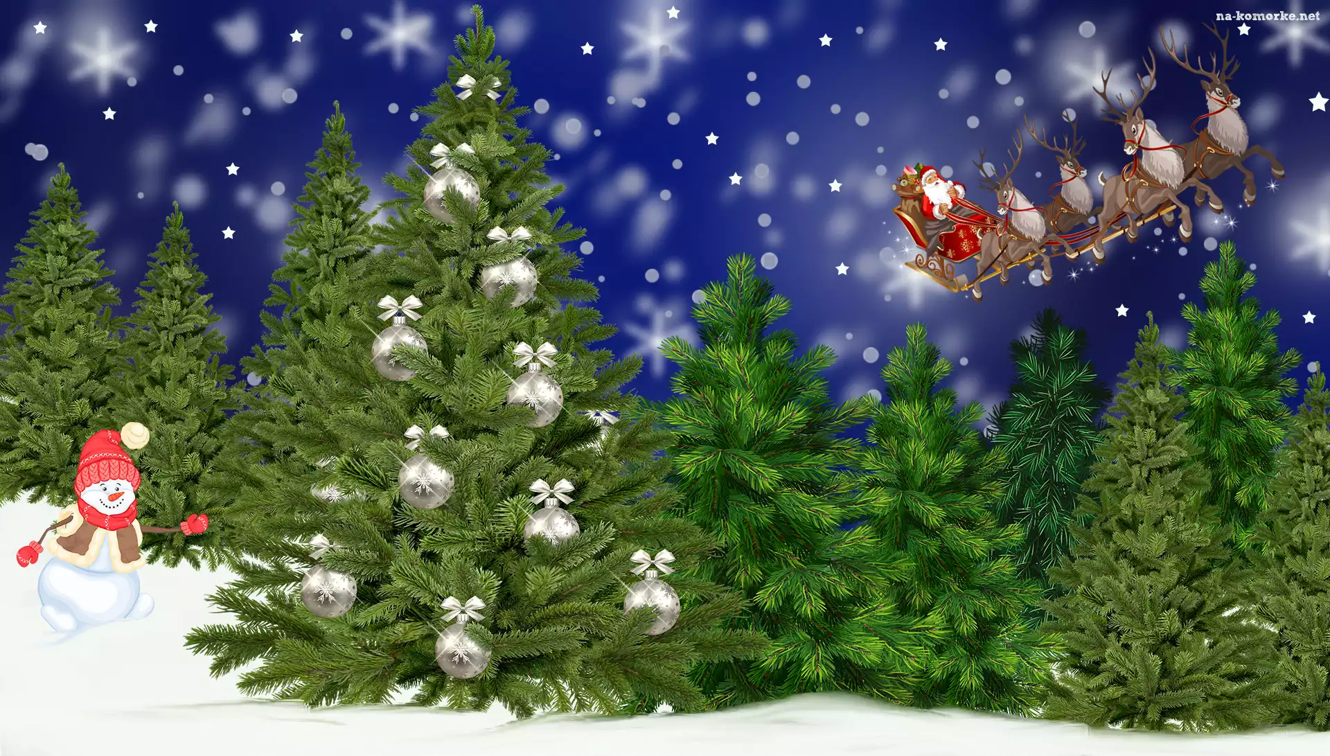 Drzewa, Zima, Mikołaj, Choinka, Grafika 2D, Las, Renifery, Bałwanek, Sanie na Komórkę