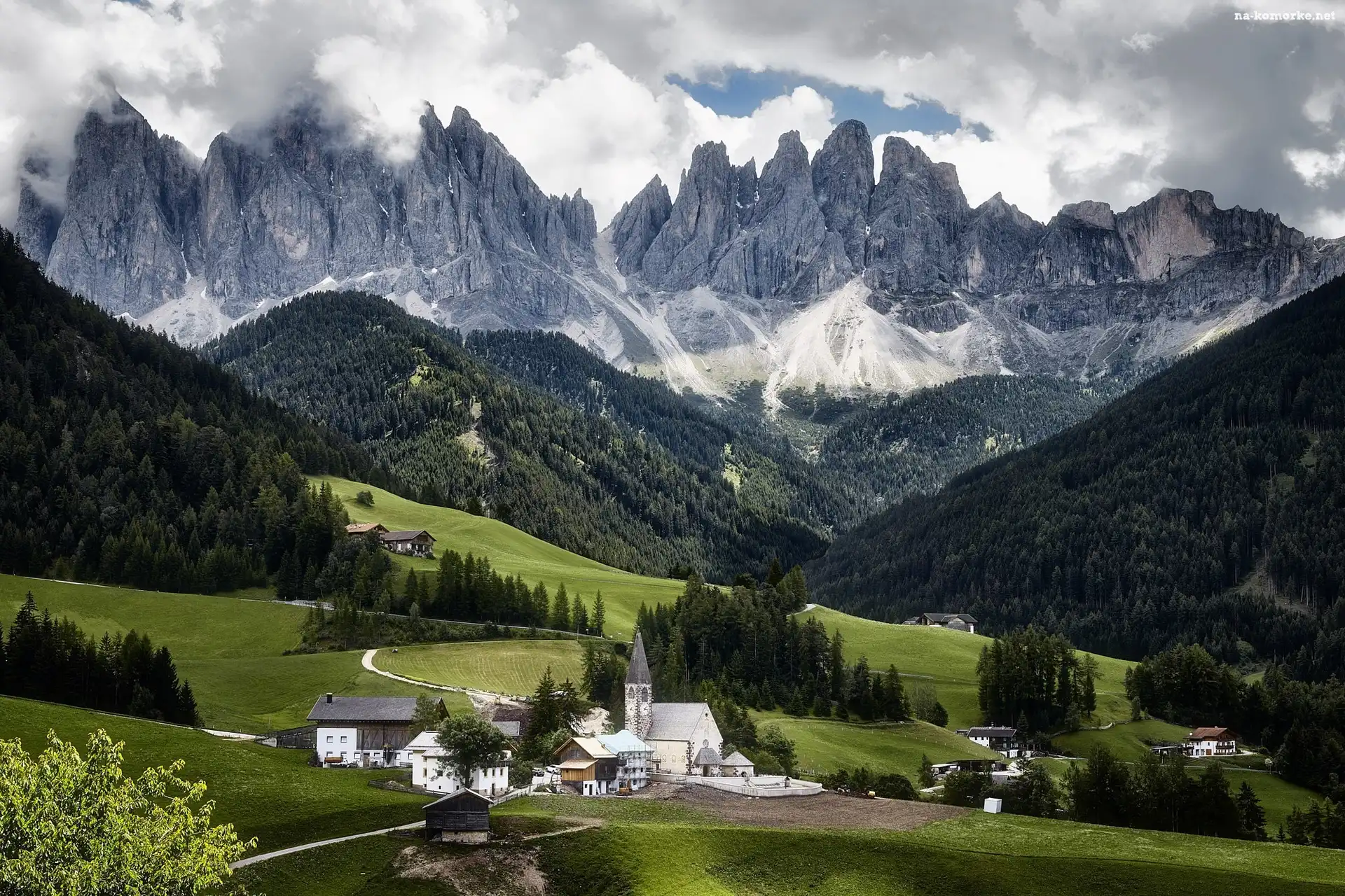 Kościół, Wieś Santa Maddalena, Dolina Val di Funes, Dolomity, Włochy, Góry na Komórkę